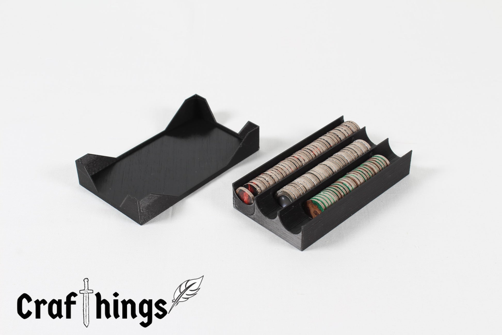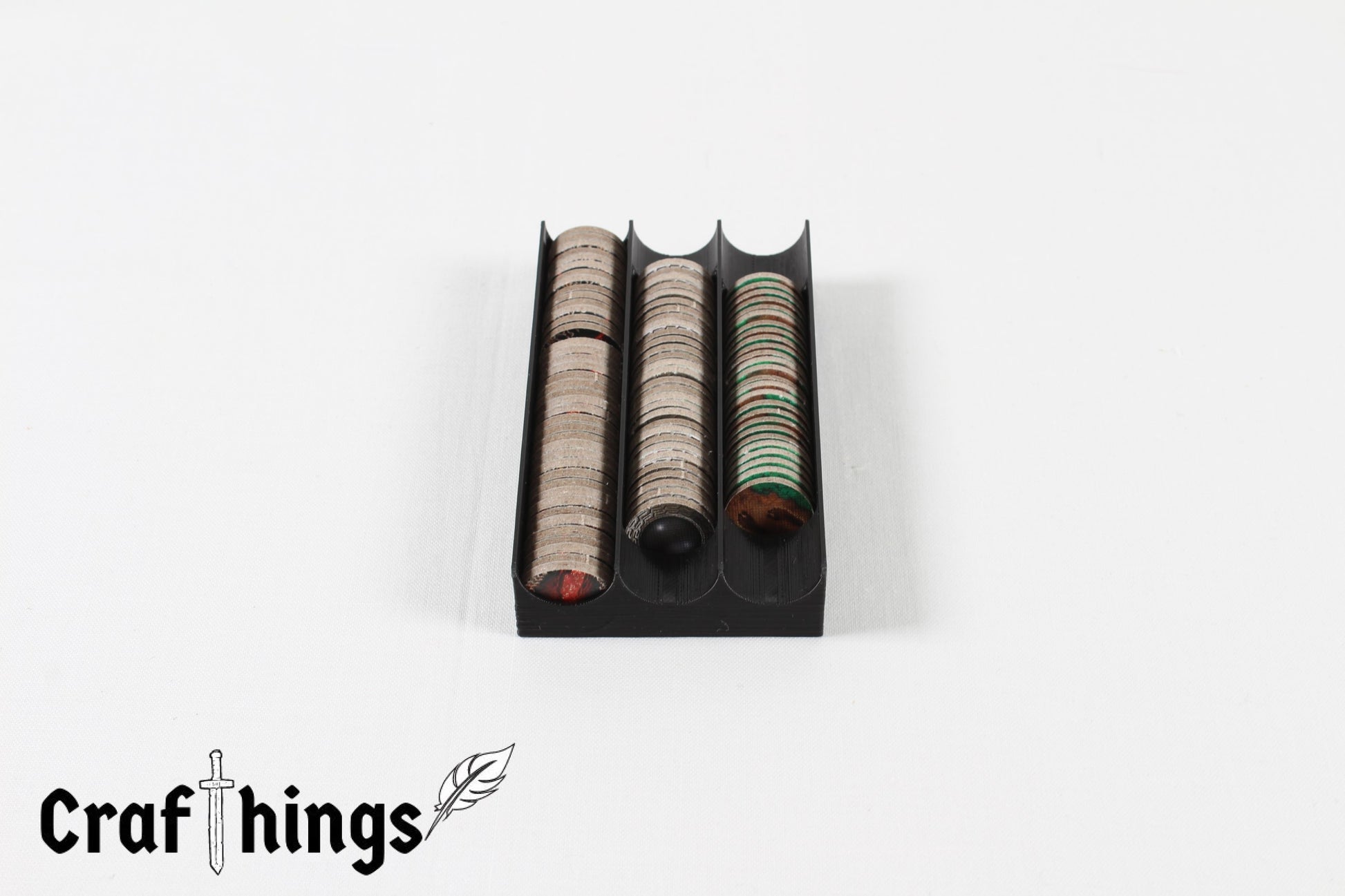Die Tokens können einfach und schnell aufbewahrt werden. Keine Chips, die mehr auf dem Tisch herumfliegen und herunterfallen können. Alle Tokens werden in dem Organizer aufgestellt und können hieraus entnommen und wieder zurückgelegt werden.