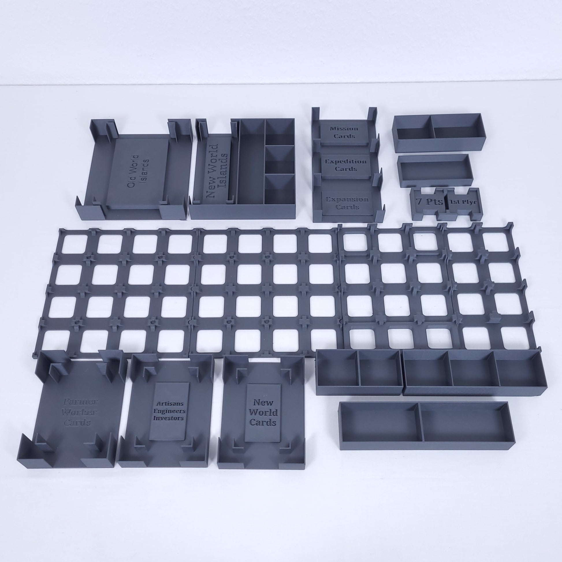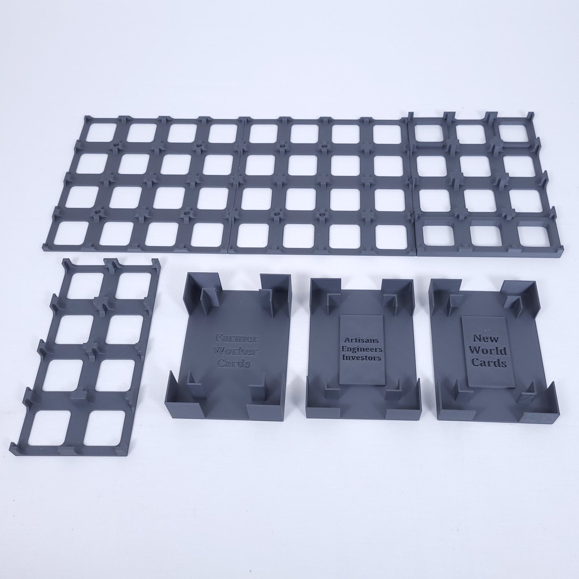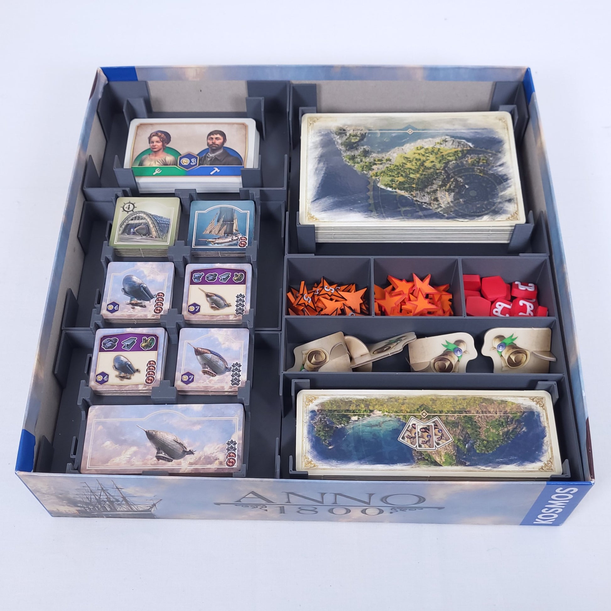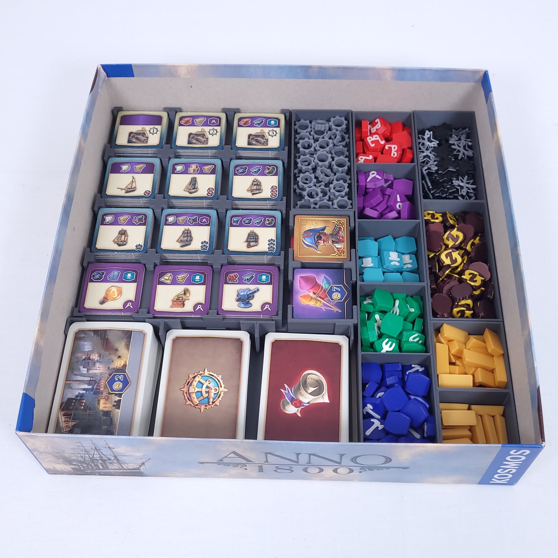 Mit diesen Aufbewahrungsboxen für ANNO 1800 und die Erweiterung können alle Spielmaterialien separat und sofort griff- und spielbereit gelagert werden.