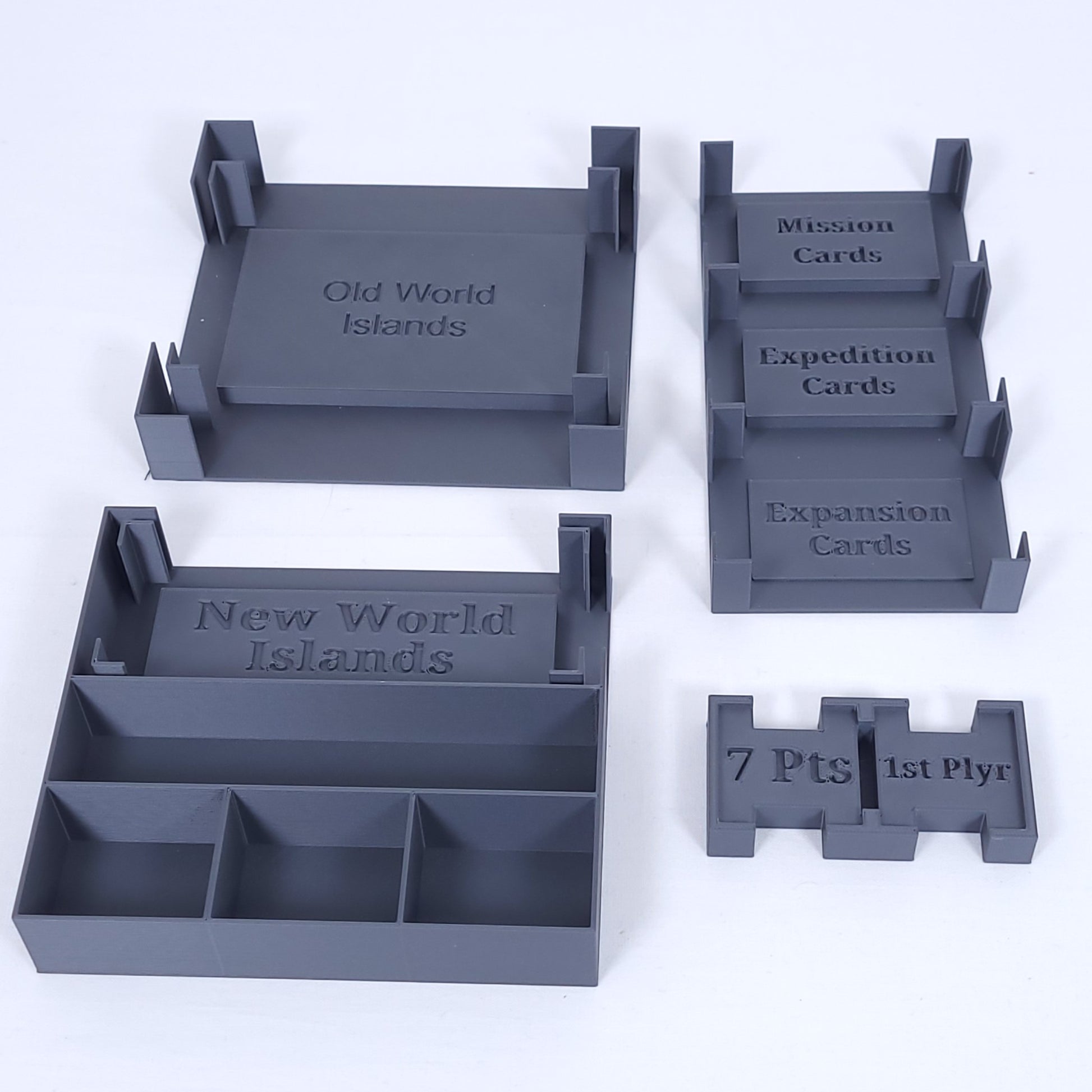 - 2 Aufbewahrungsboxen für die Marinetoken (Handel, Entdeckung) und die Goldtoken (1 Gold, 5 Gold)