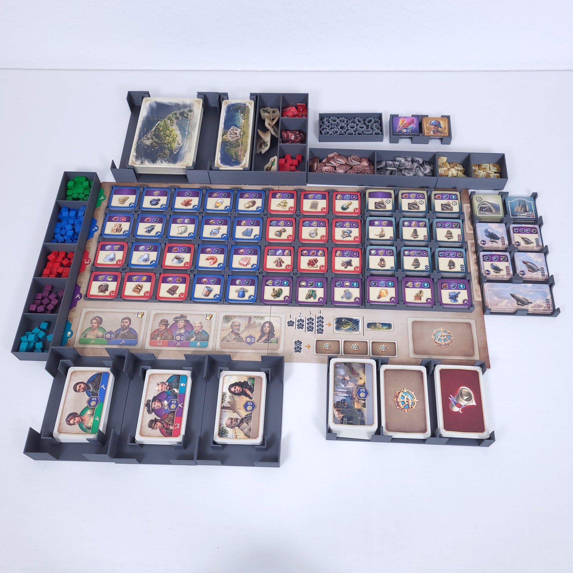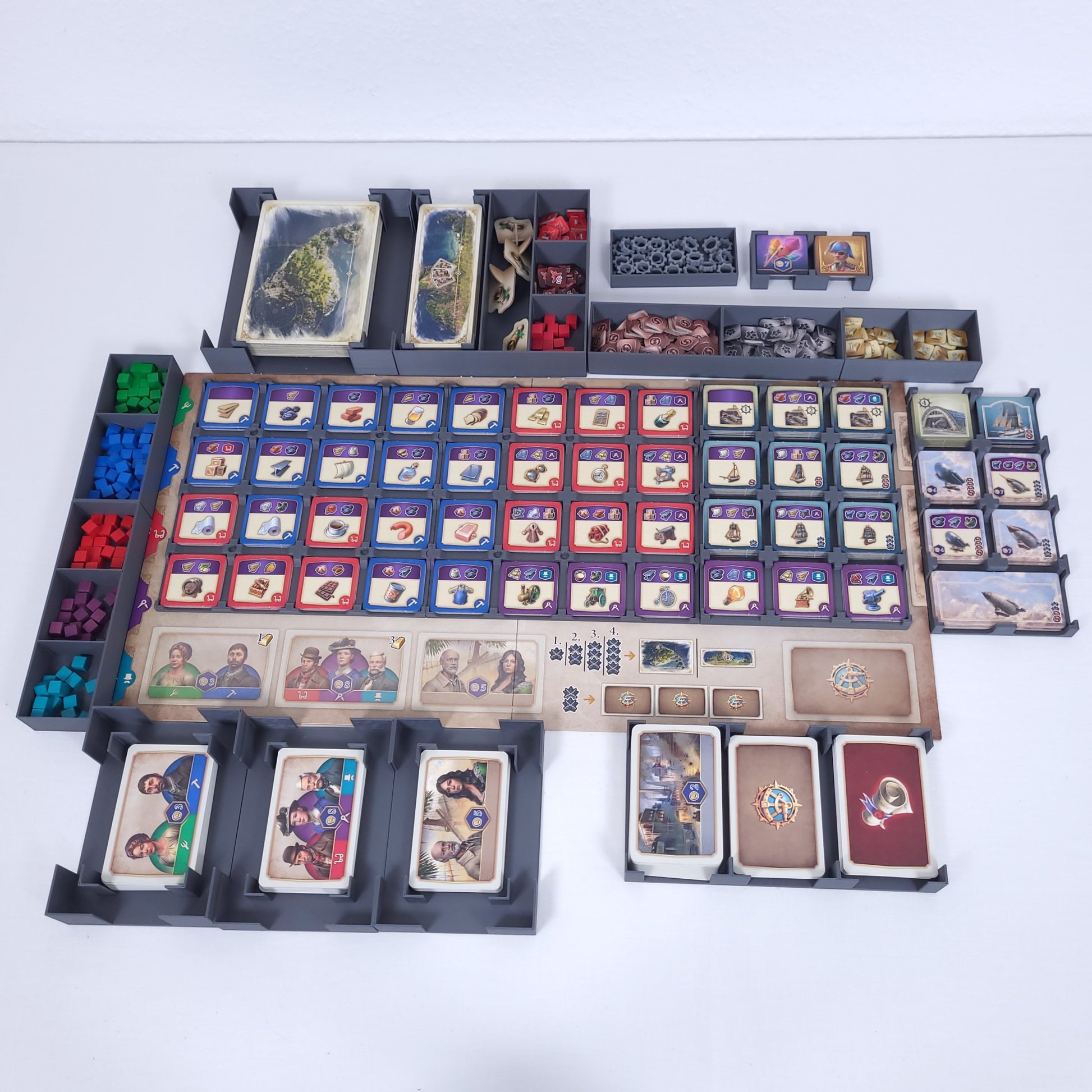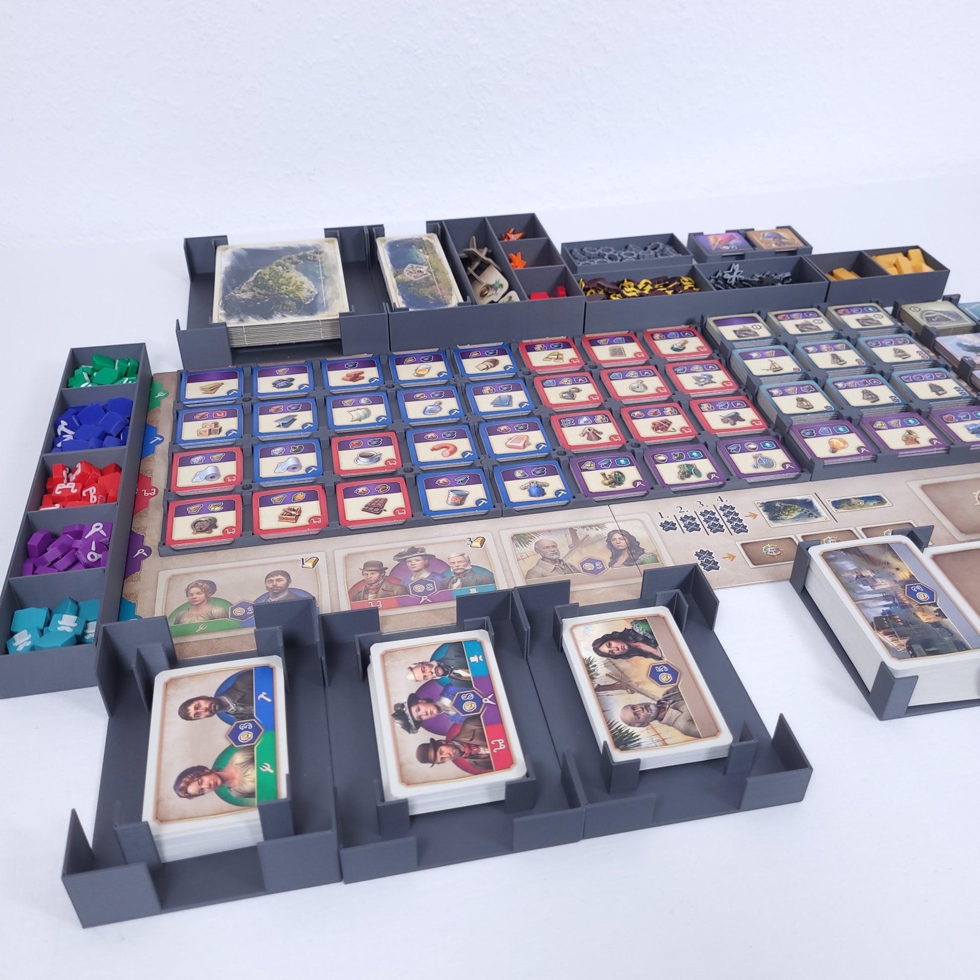 Die Karten und Token werden in verschiedenen Einsätzen aufbewahrt und können neben dem Spielbrett schnell und unkompliziert aufgebaut werden. Der Einsatzist so konzipiert, dass der ganze Innenraum der Originalspielbox gefüllt wird, um eine senkrechte Lagerung des Spiels zu ermöglichen.