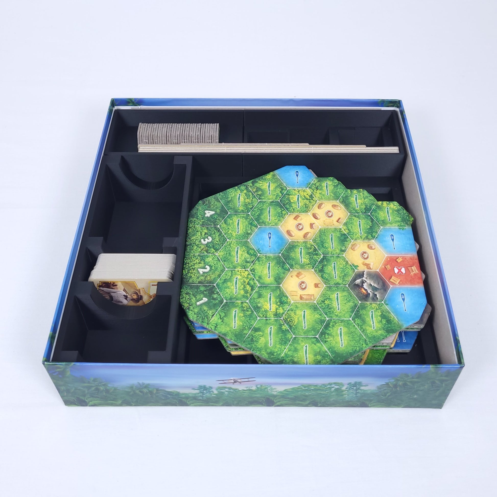 In diesem vierteiligen Einsatz können alle Spielmaterialien aus dem Hauptspiel "Wettlauf nach El Dorado" sowie aus den Erweiterungen "Die goldenen Tempel" und "Helden und Dämonen" in der Hauptspielbox gelagert und spielbereit aufbewahrt werden.