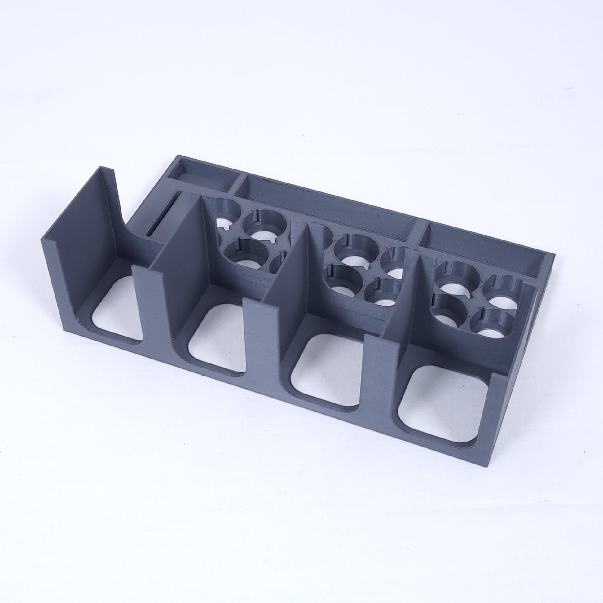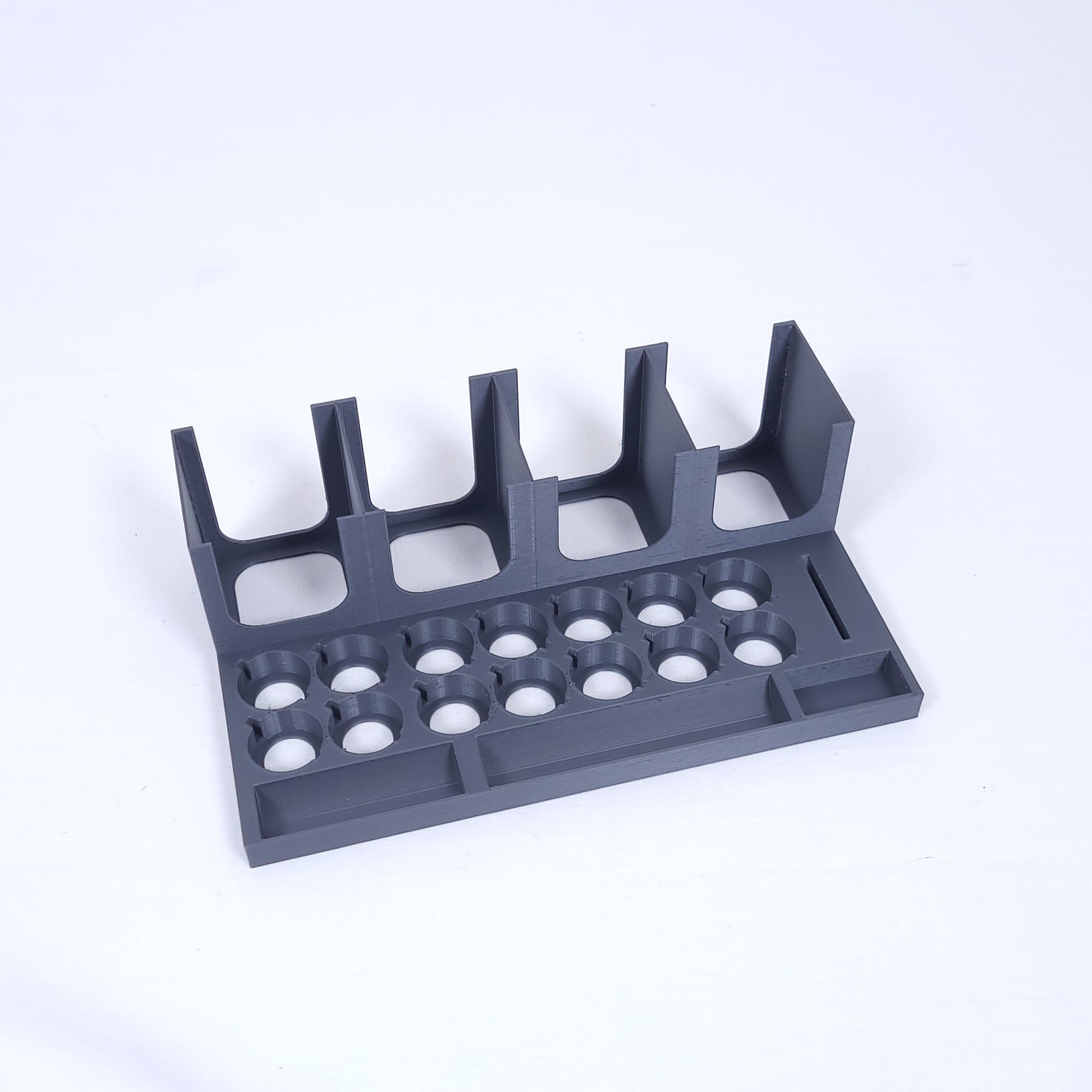 In dem Organizer können die 14 Heldenfiguren und alle Plättchen aus dem Hauptspiel und der Erweiterungen einfach aufbewahrt und zum Spielen aus der Halterung entnommen werden. Zudem kann auch das Zubehör (Würfel, Fluchmarker etc.) mit gelagert werden.