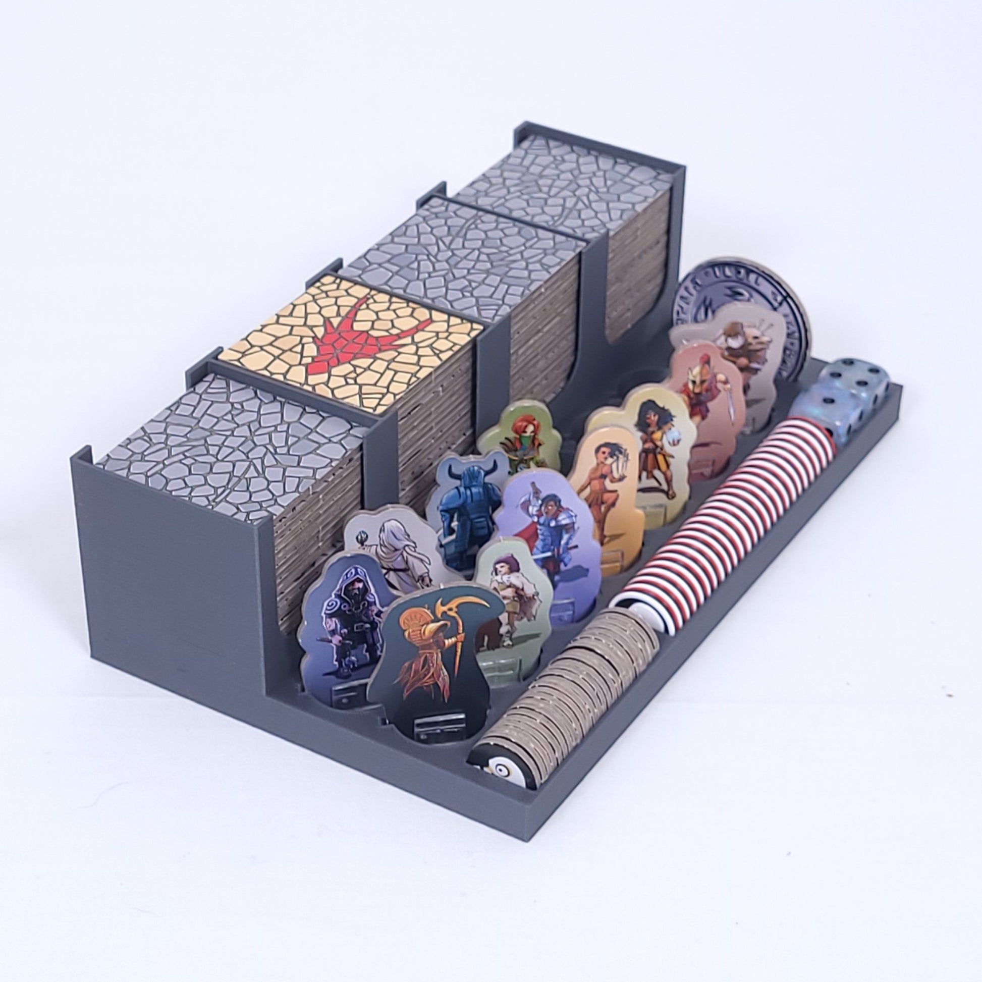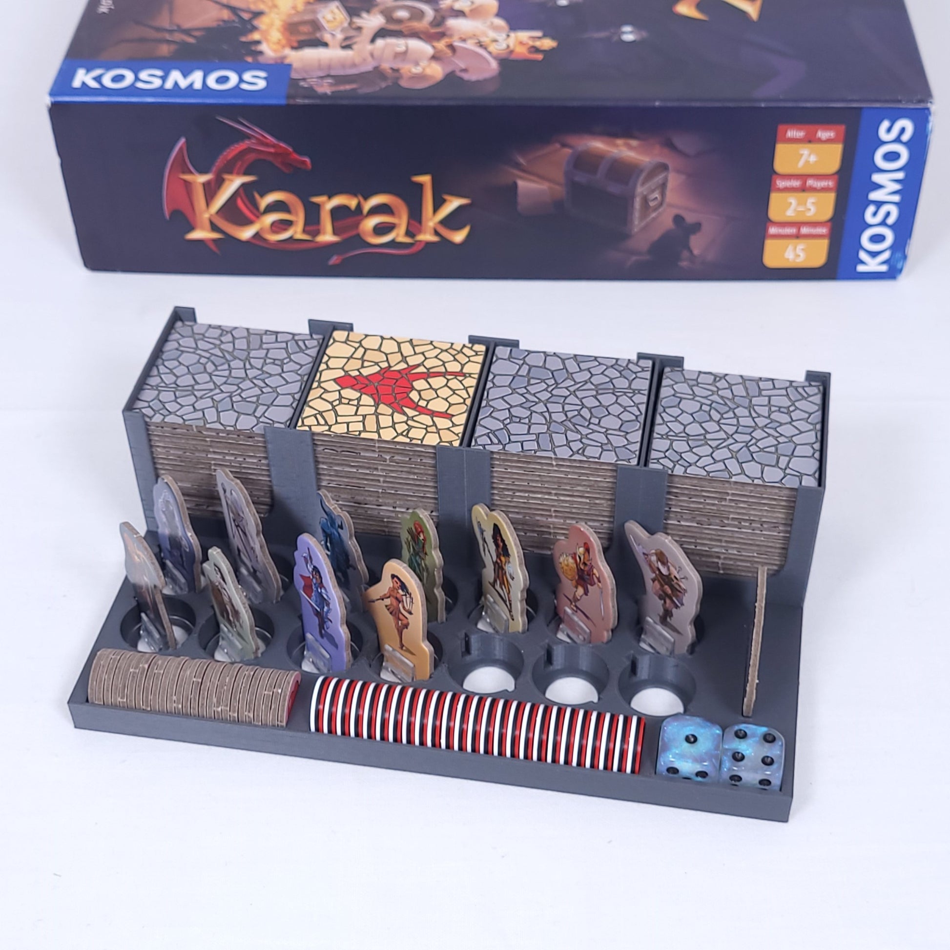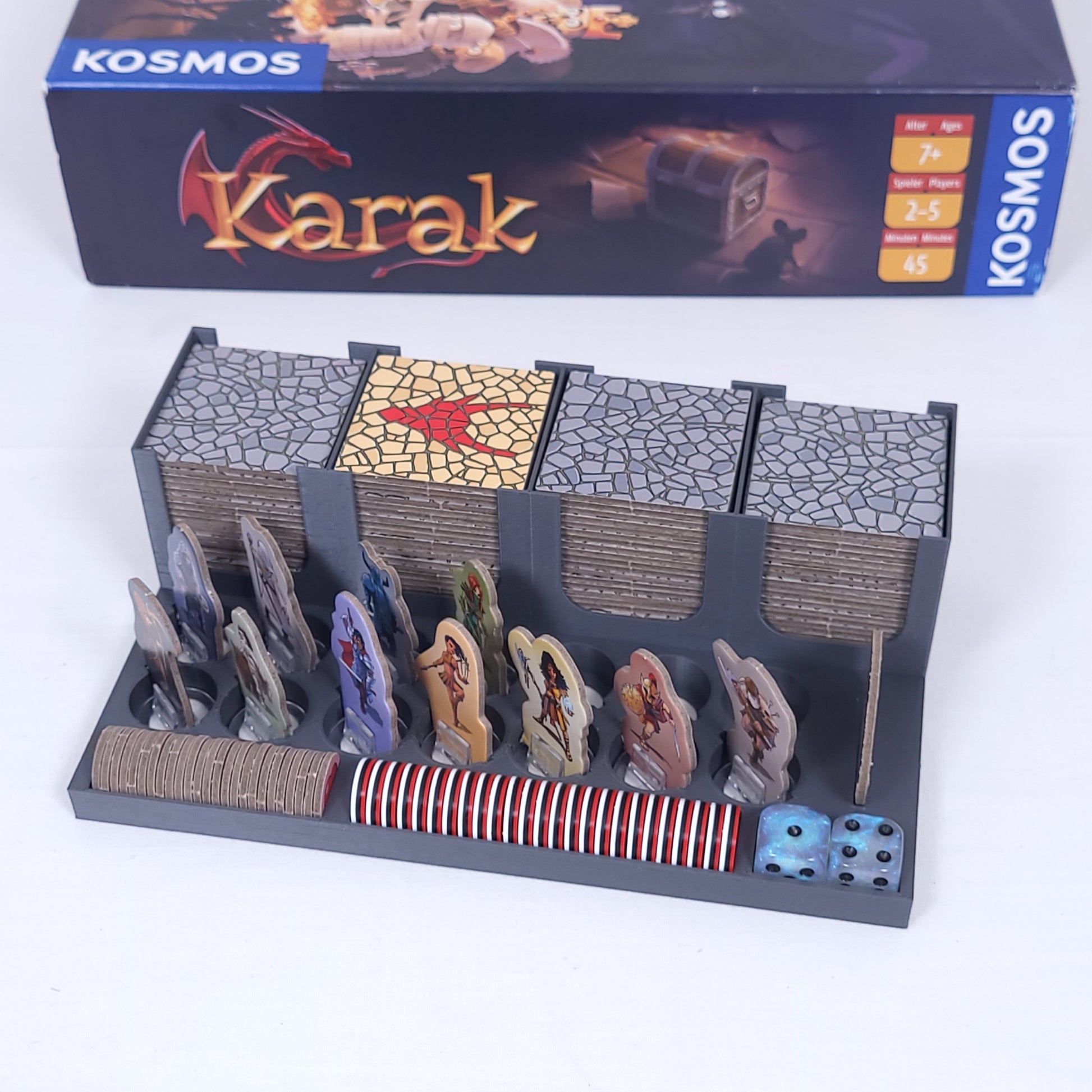 Eine praktische Organisationshilfe für die Helden, die Plättchen und das Zubehör aus dem Spiel Karak und der beiden Erweiterungen Regent und Sidhar, Krima und Elspeth.