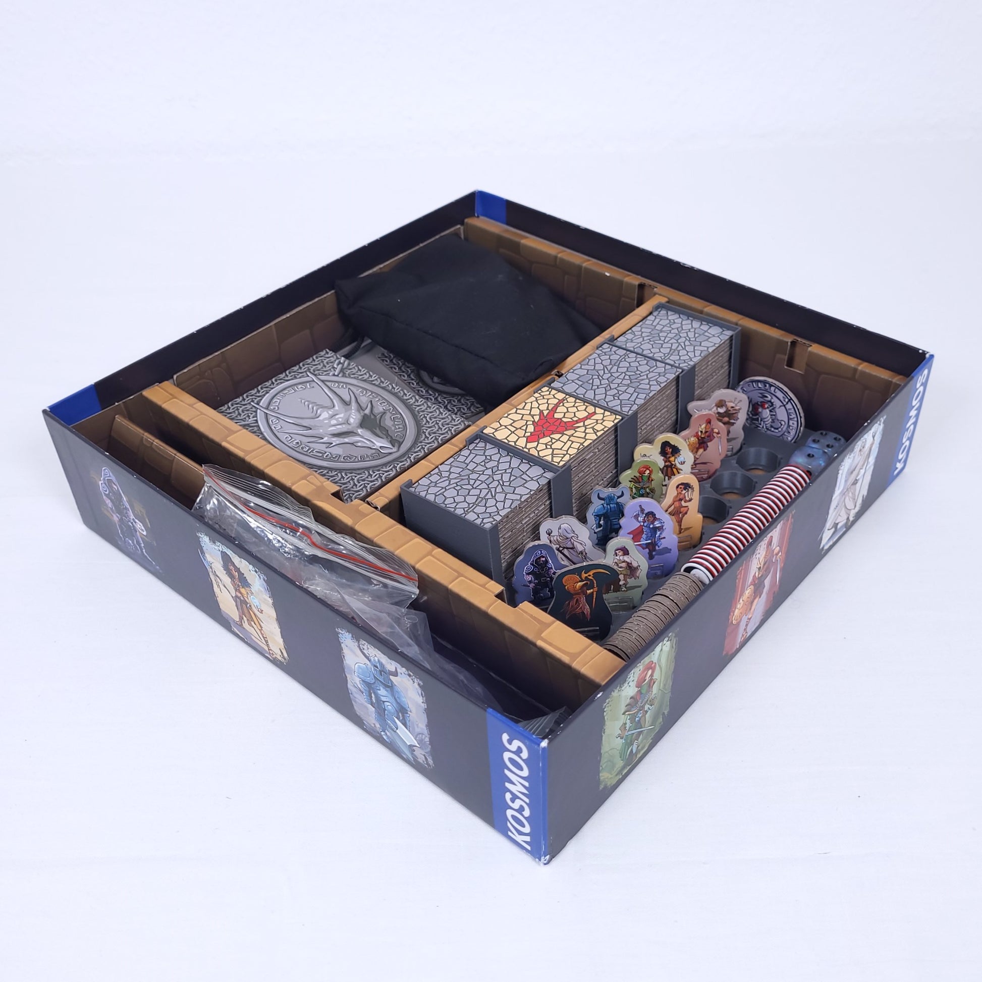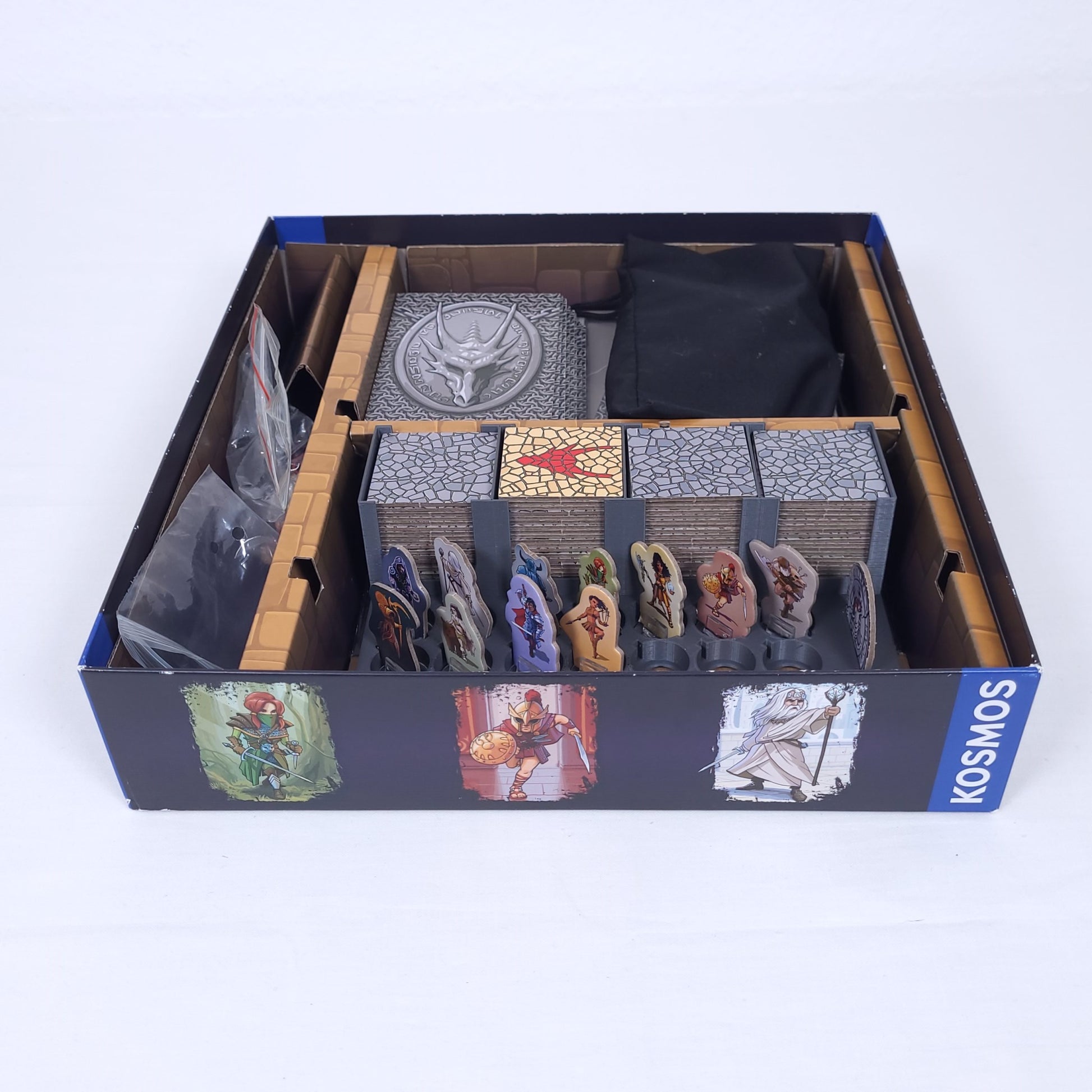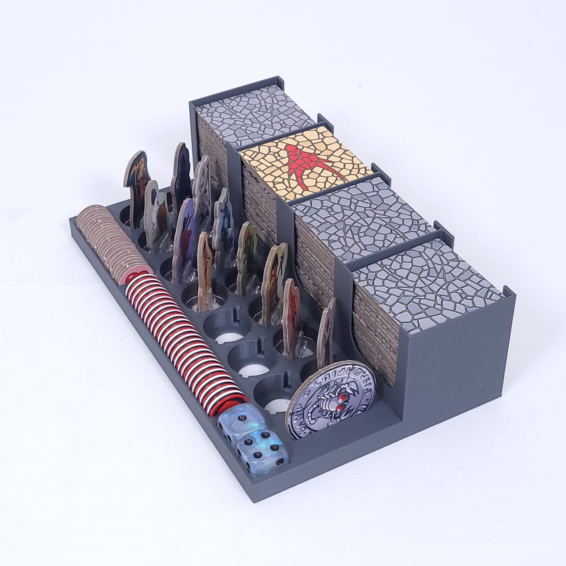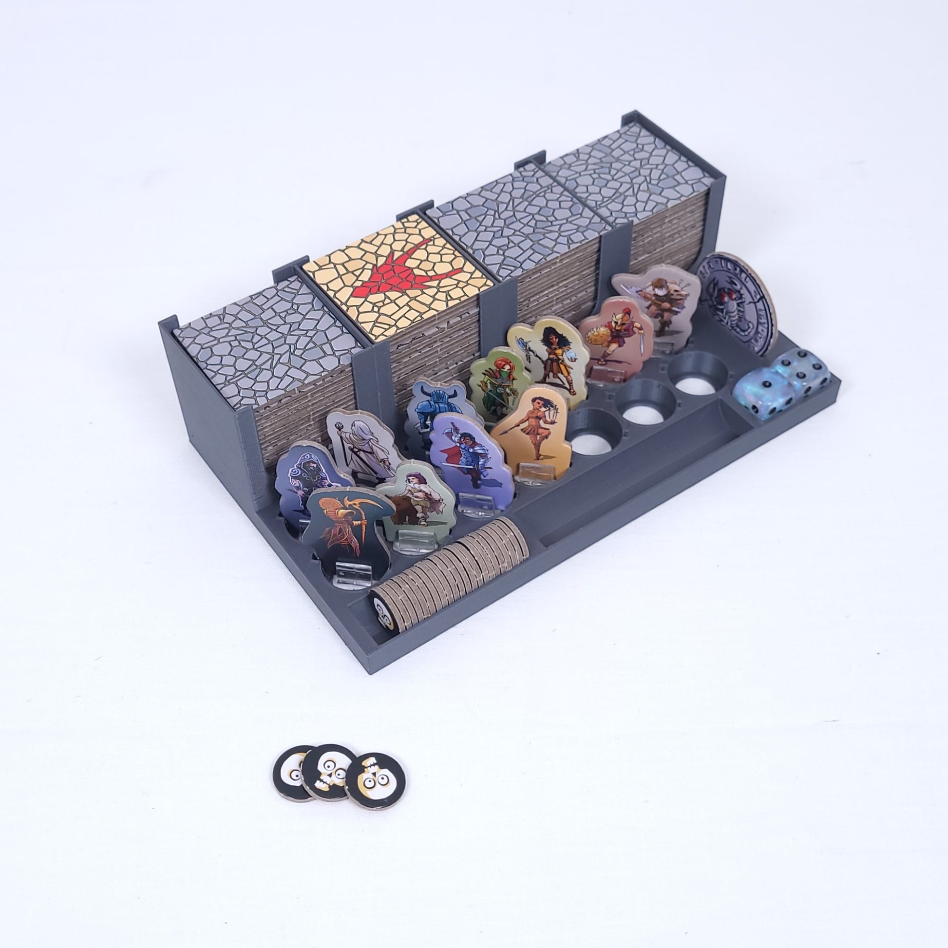 Eine praktische Organisationshilfe für die Helden, die Plättchen und das Zubehör aus dem Spiel Karak und der beiden Erweiterungen Regent und Sidhar, Krima und Elspeth.