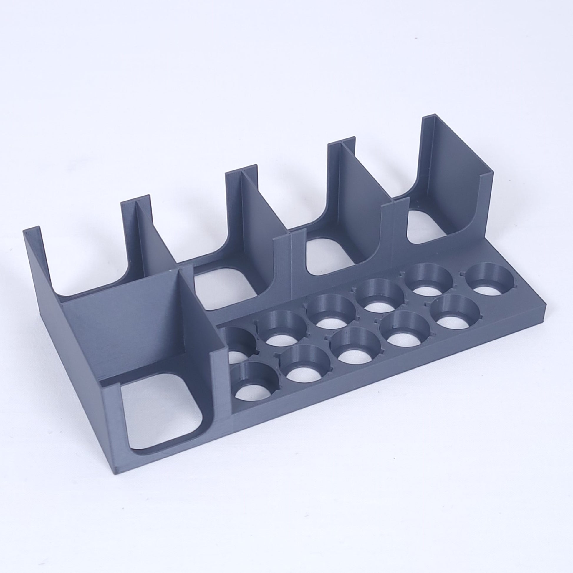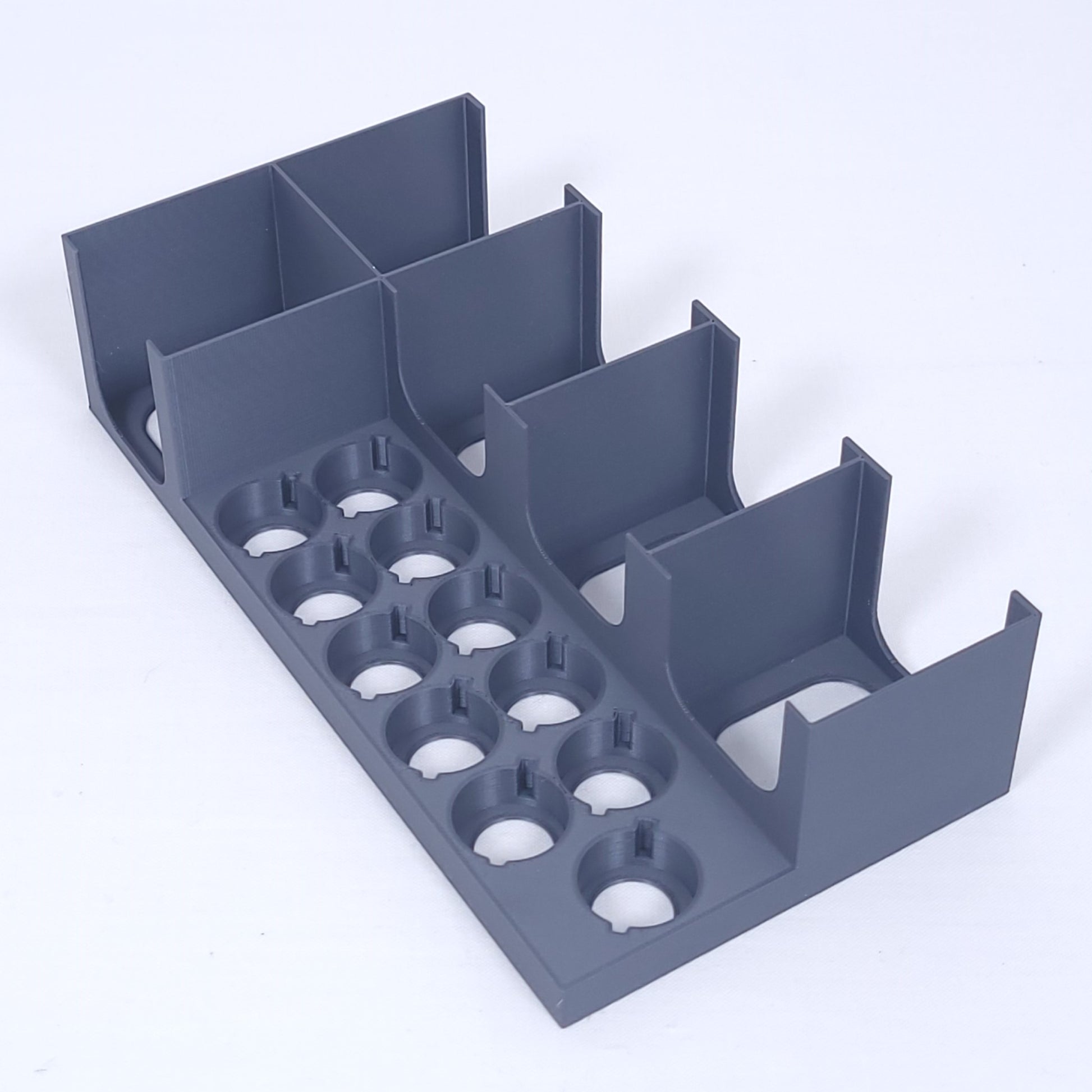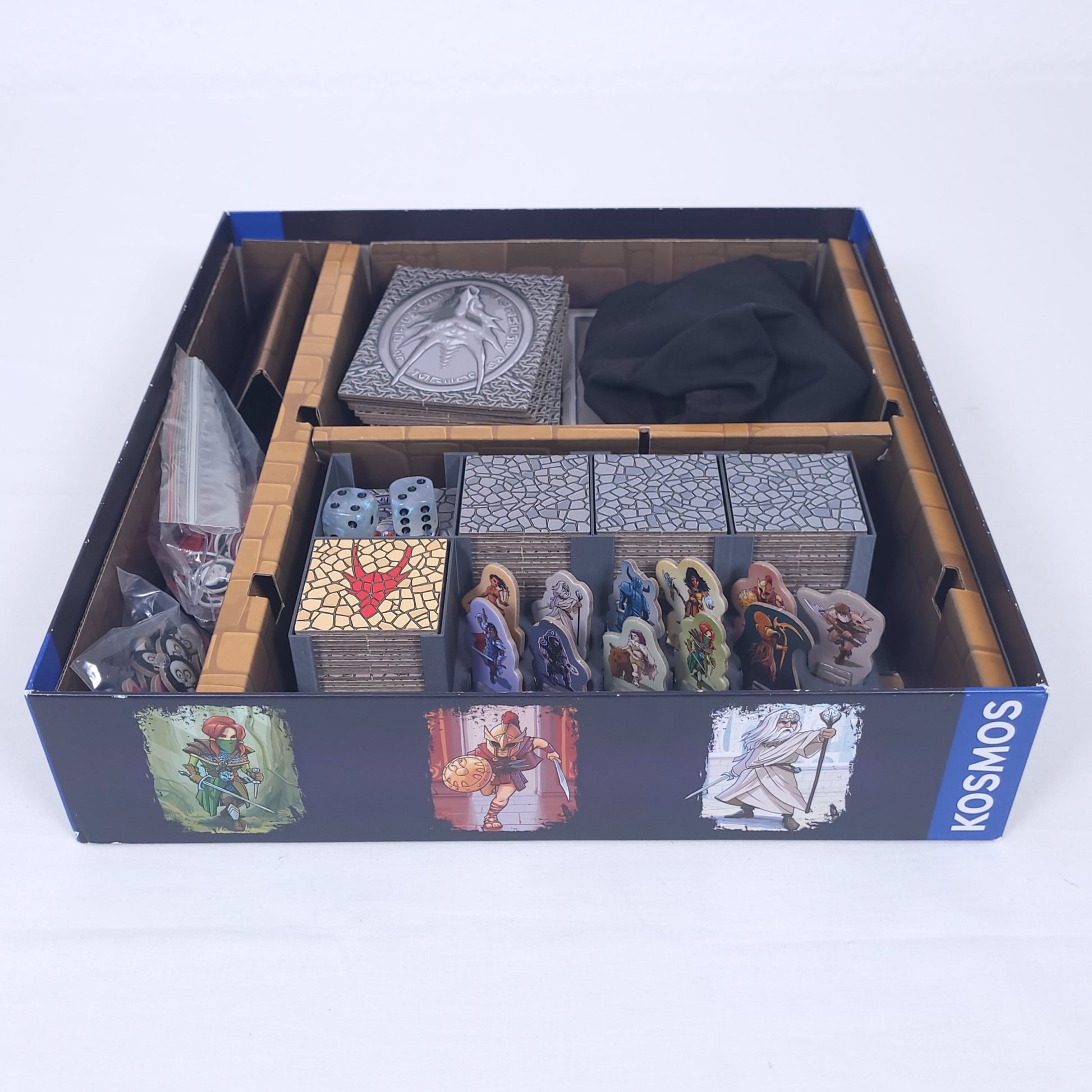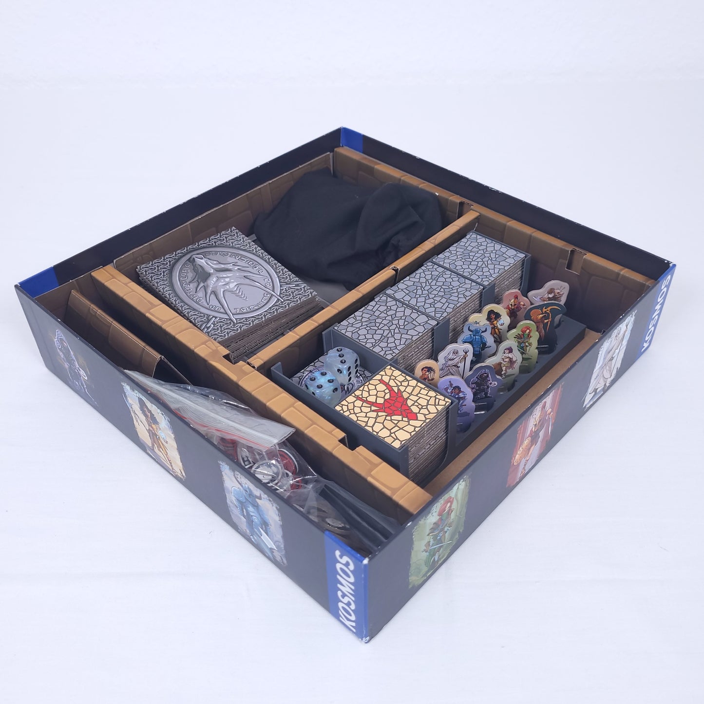 In dem Organizer können die 11 Heldenfiguren und alle Plättchen aus dem Hauptspiel und der Erweiterung einfach aufbewahrt und zum Spielen aus der Halterung entnommen werden. Zudem kann auch das Zubehör (Würfel, Fluchmarker etc.) mit in einen Turm gelegt werden.