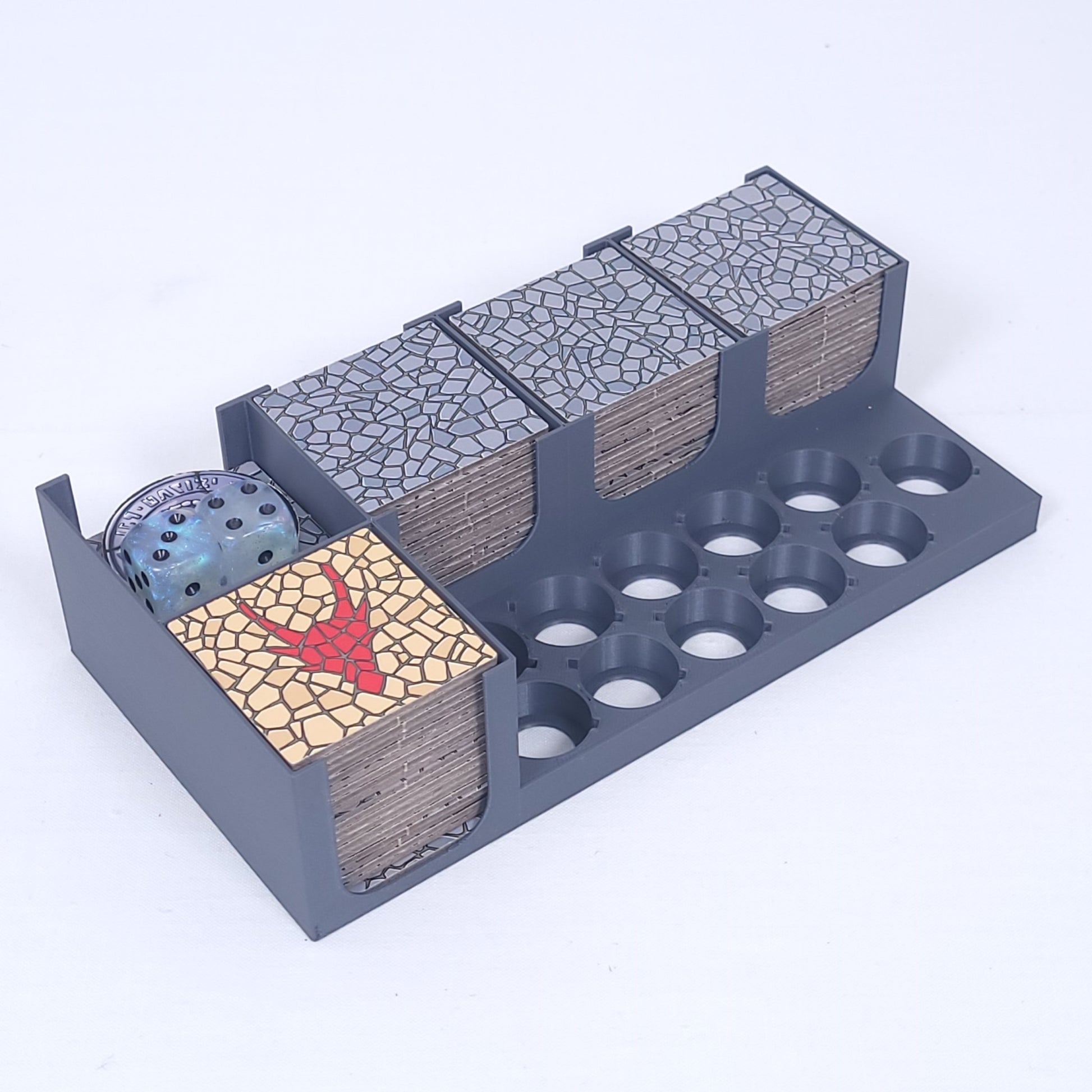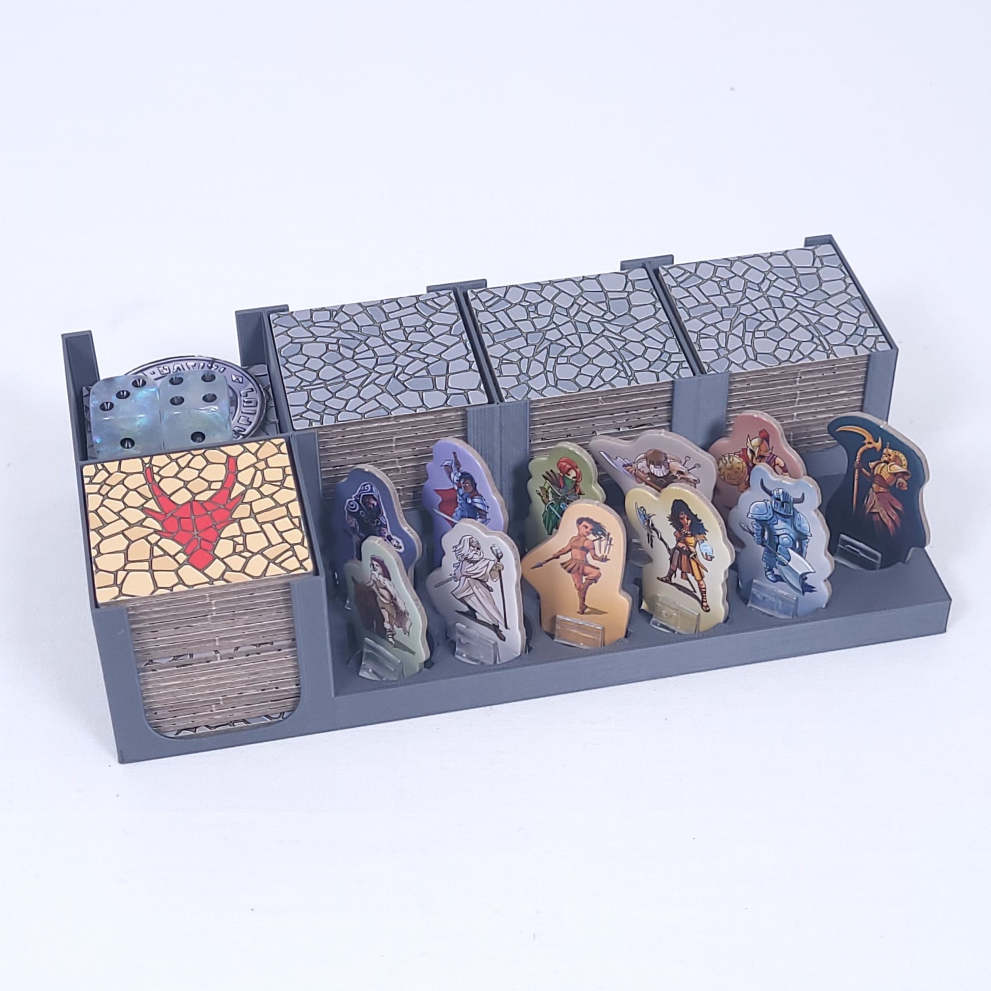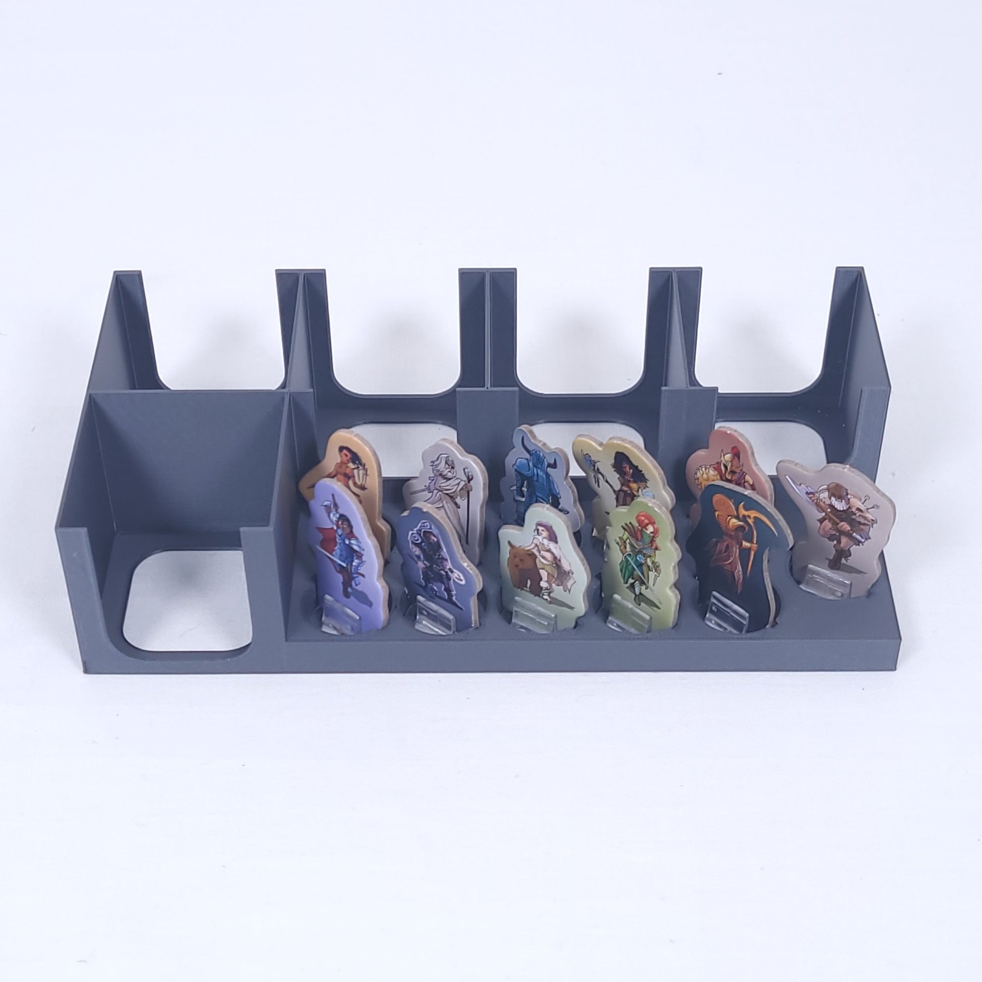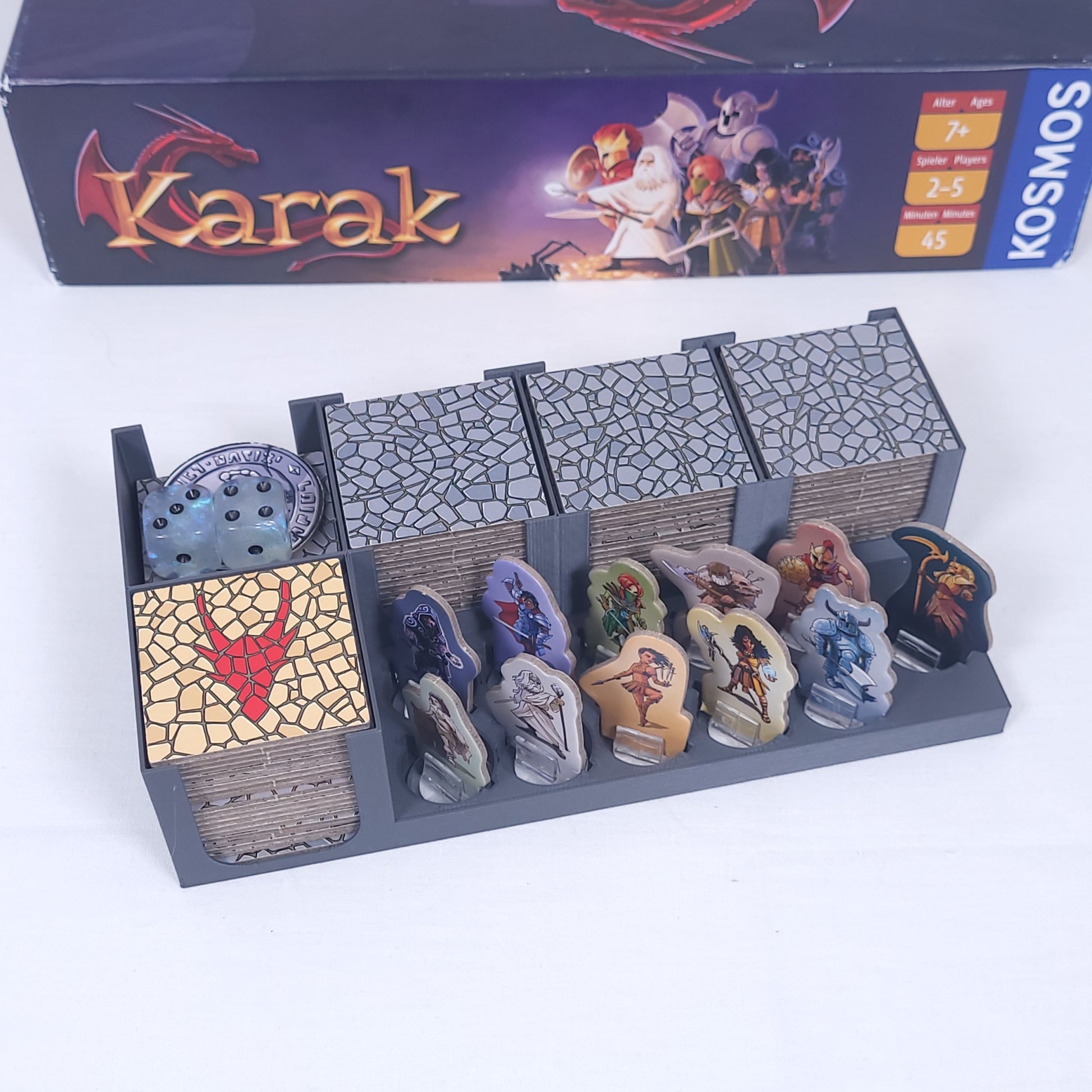 Eine praktische Organisationshilfe für die Helden, die Plättchen und das Zubehör aus dem Spiel Karak und der Erweiterung Regent.