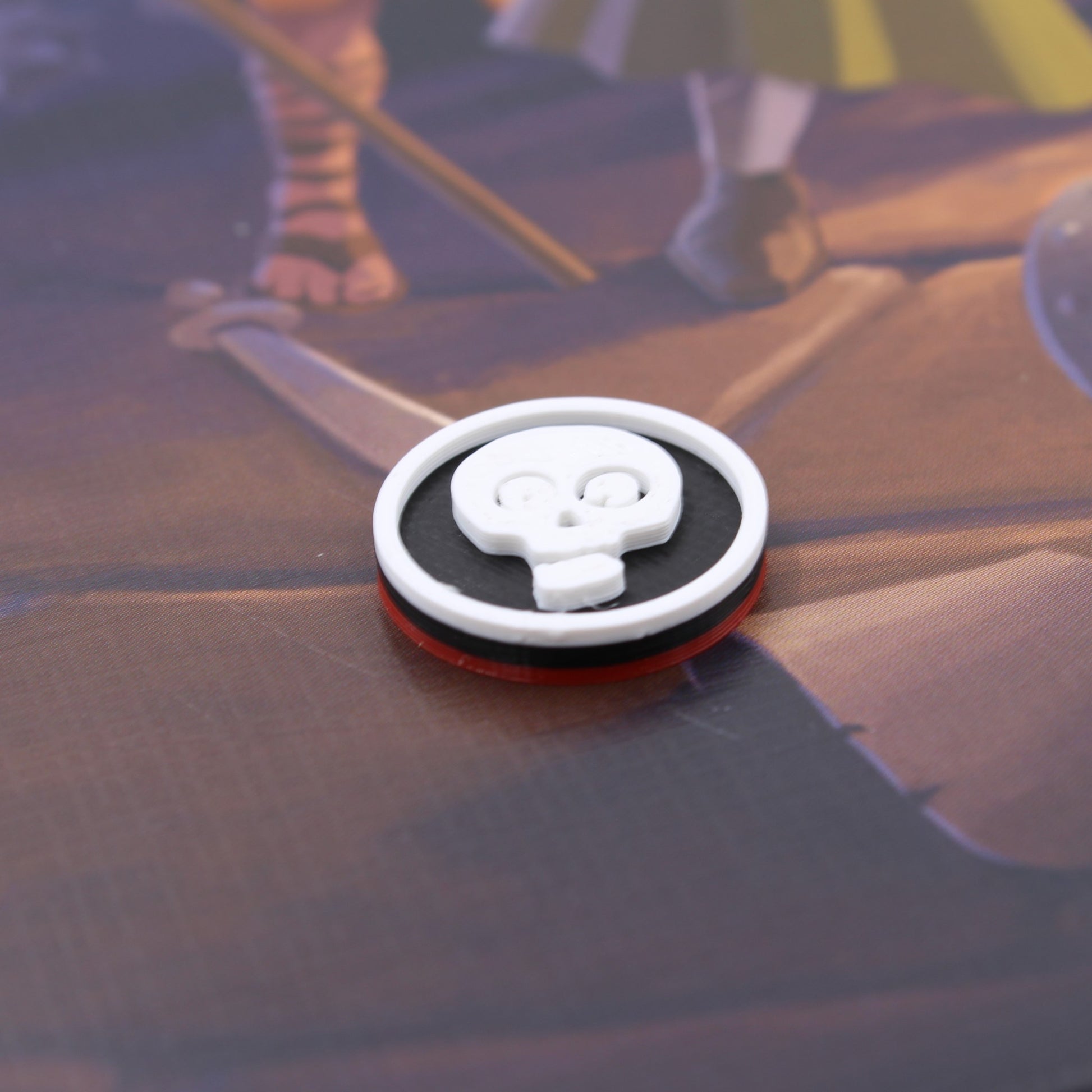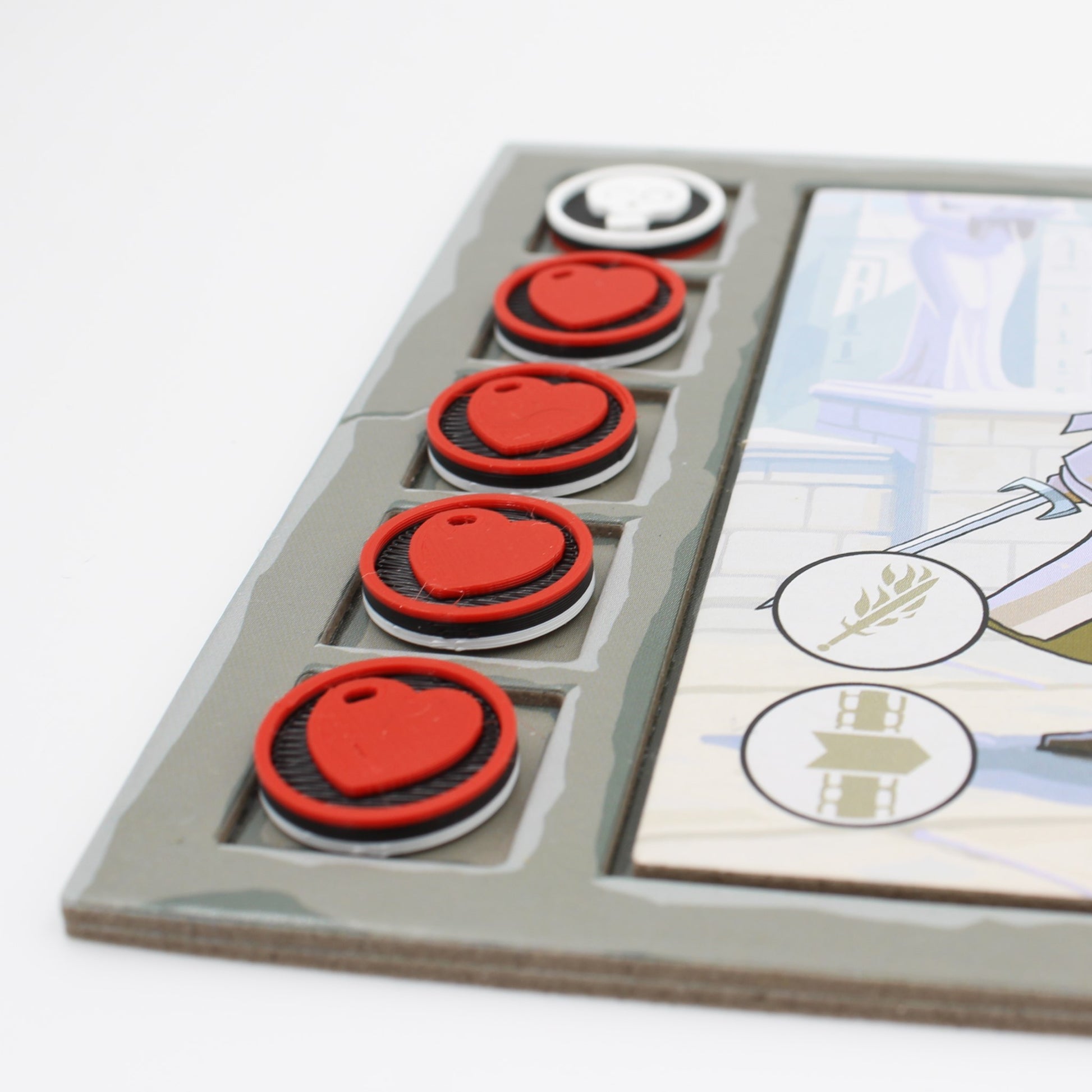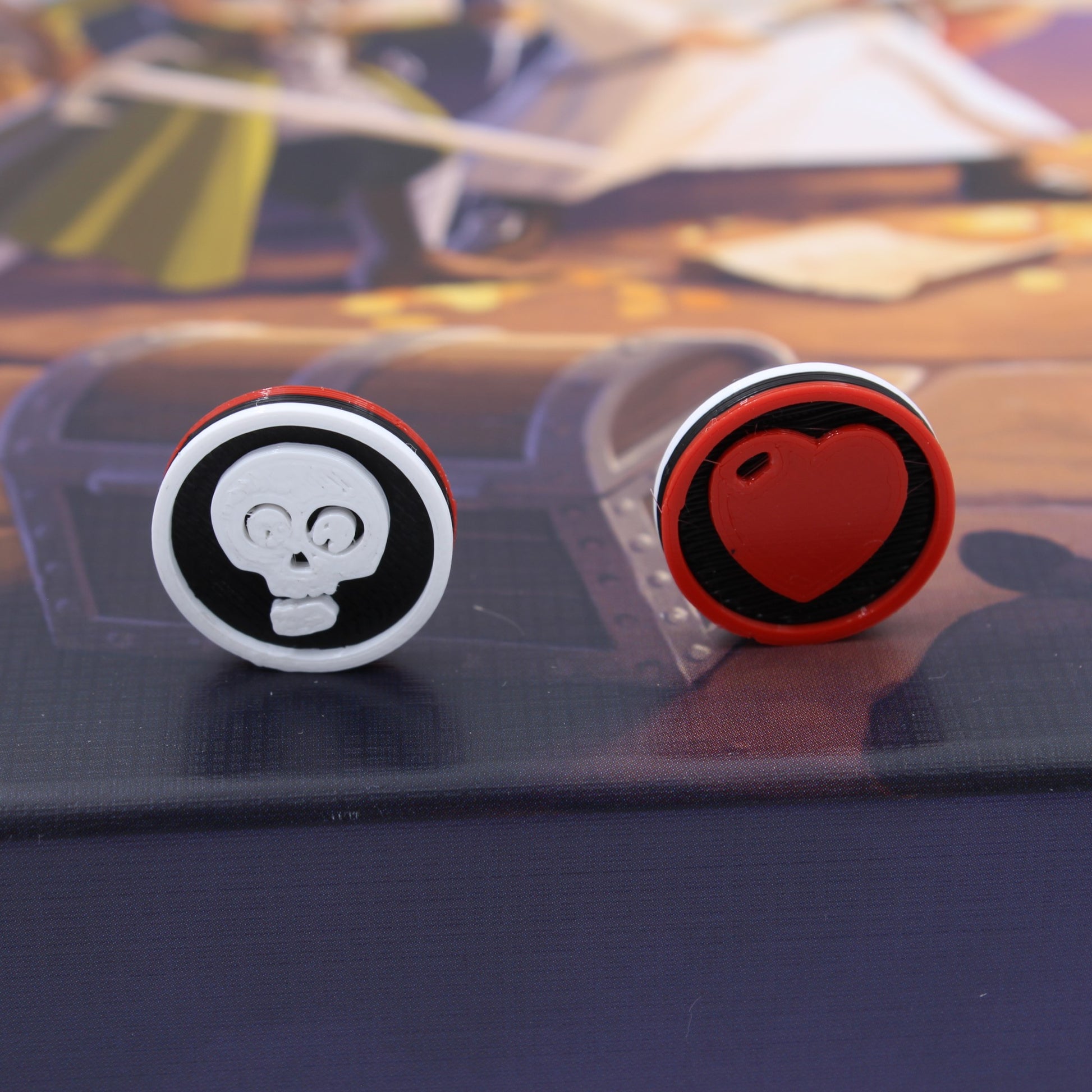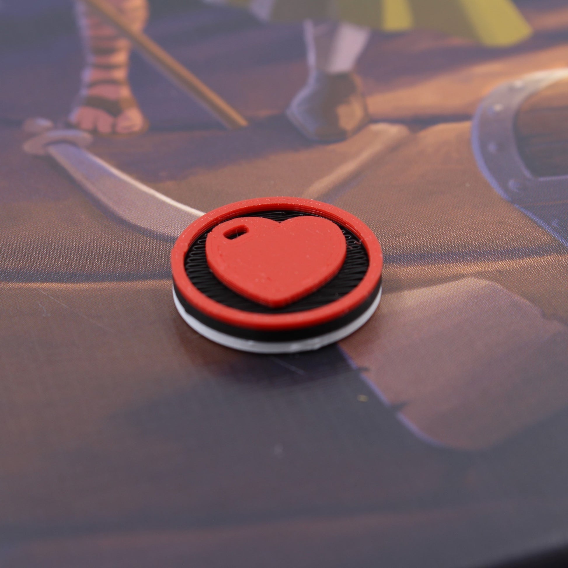 Auf der einen Seite sind die roten Lebens- bzw. Herzsymbole, auf der anderen Seite die weißen Schadens- bzw. Totenkopfsymbole abgebildet. Die Symbole und der äußere Kreis sind etwas höher um einen schöneren 3D-Effekt zu erzielen und die Greifbarkeit zu verbessern. Die Marker haben den gleichen Durchmesser wie die originalen Token und passen optimal in die Heldentableaus.