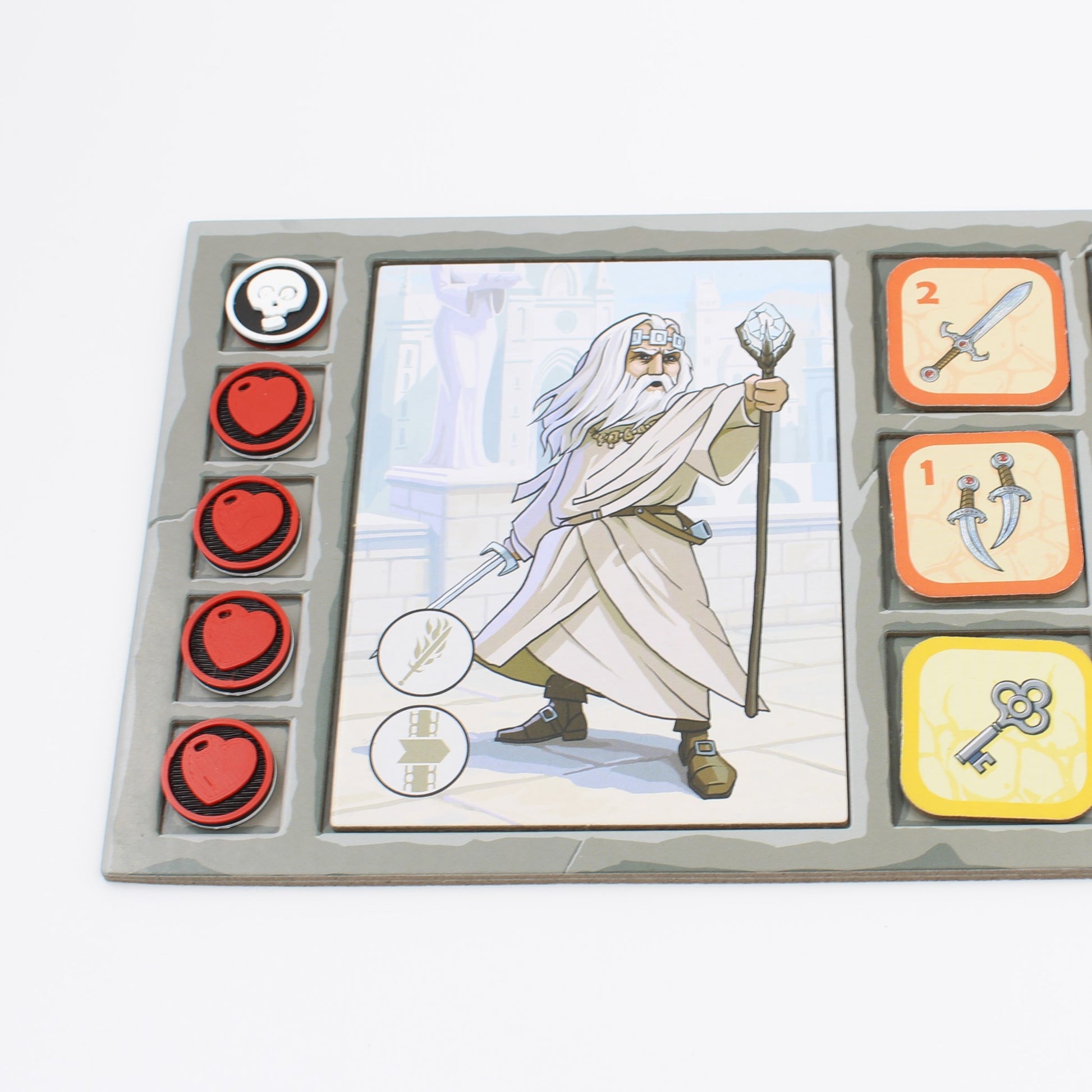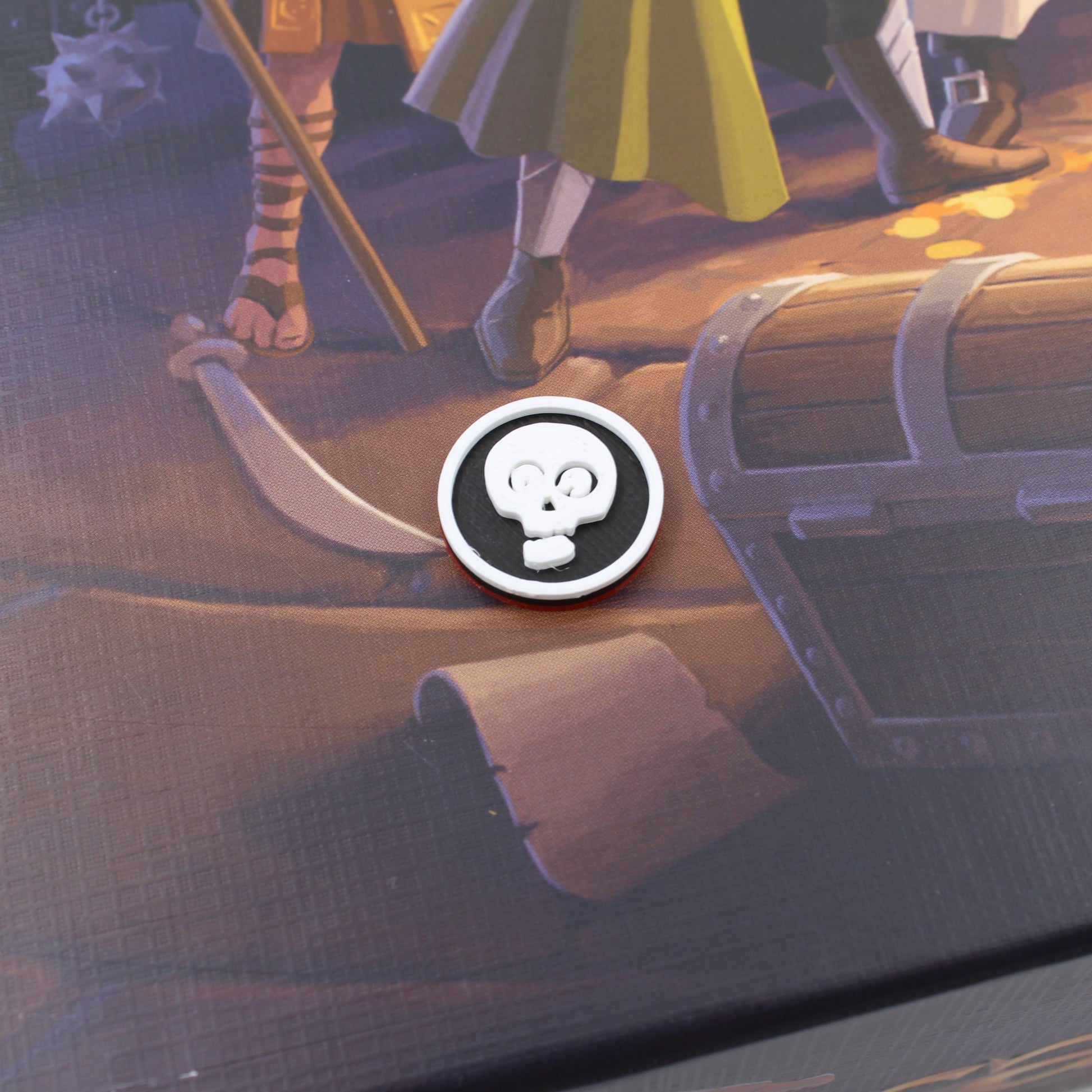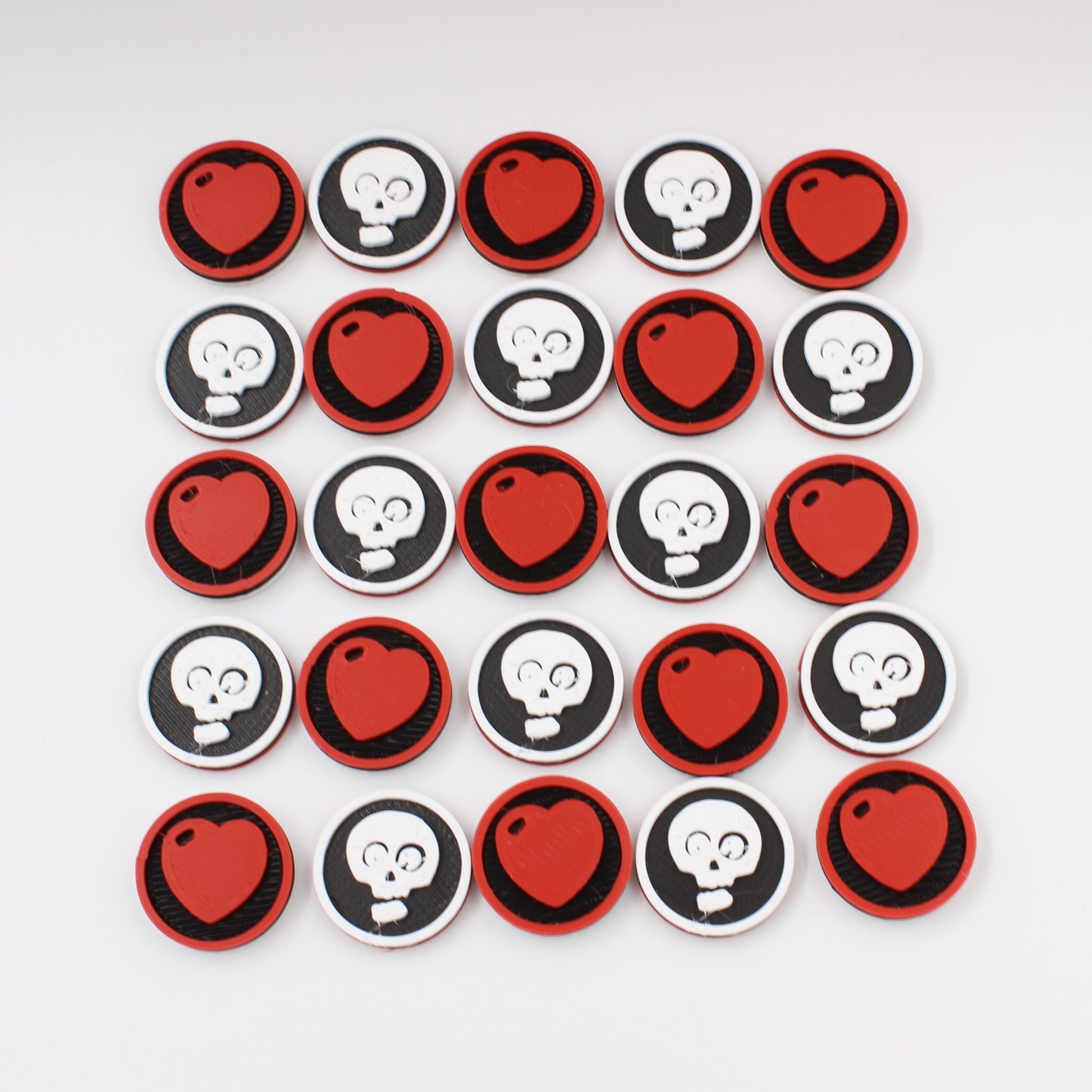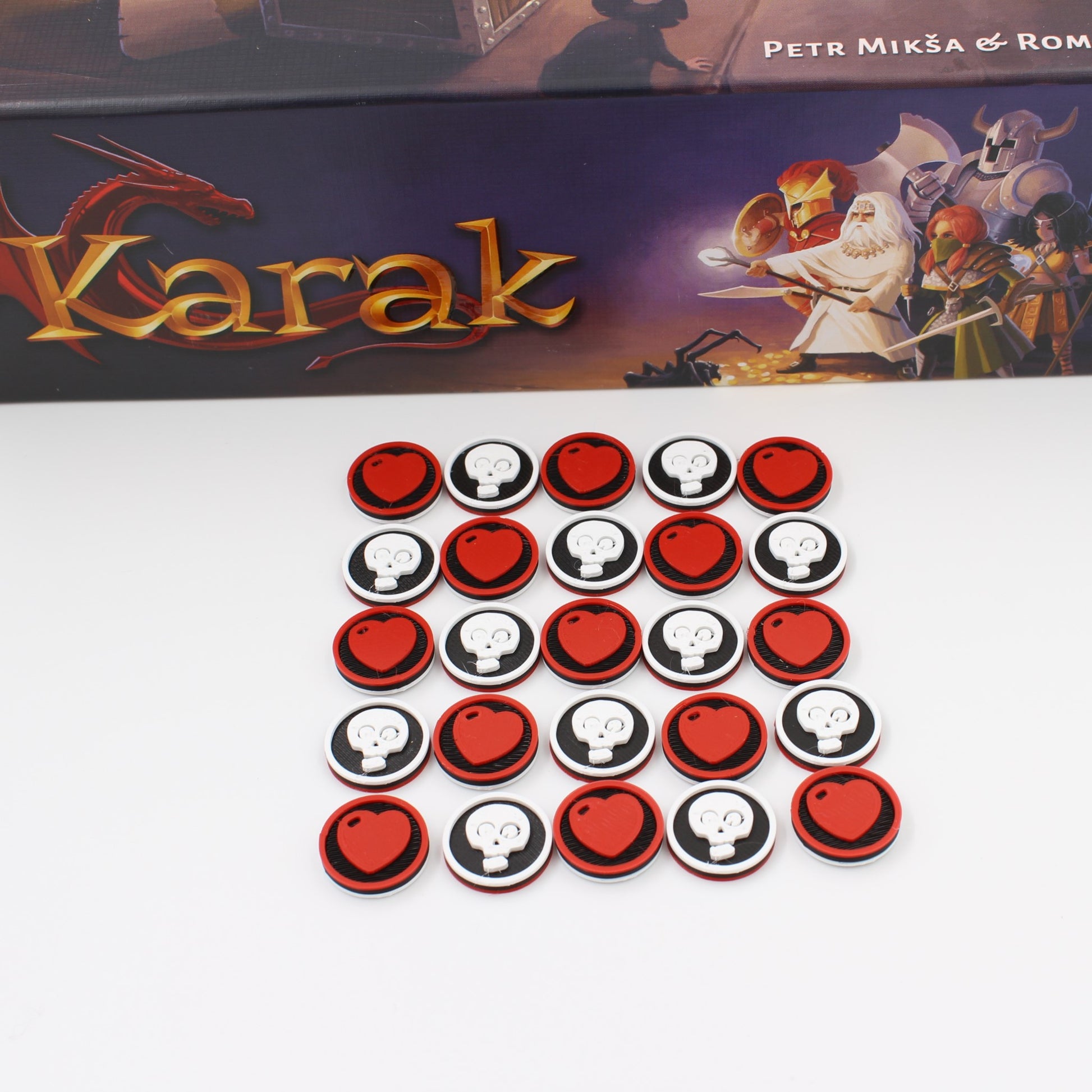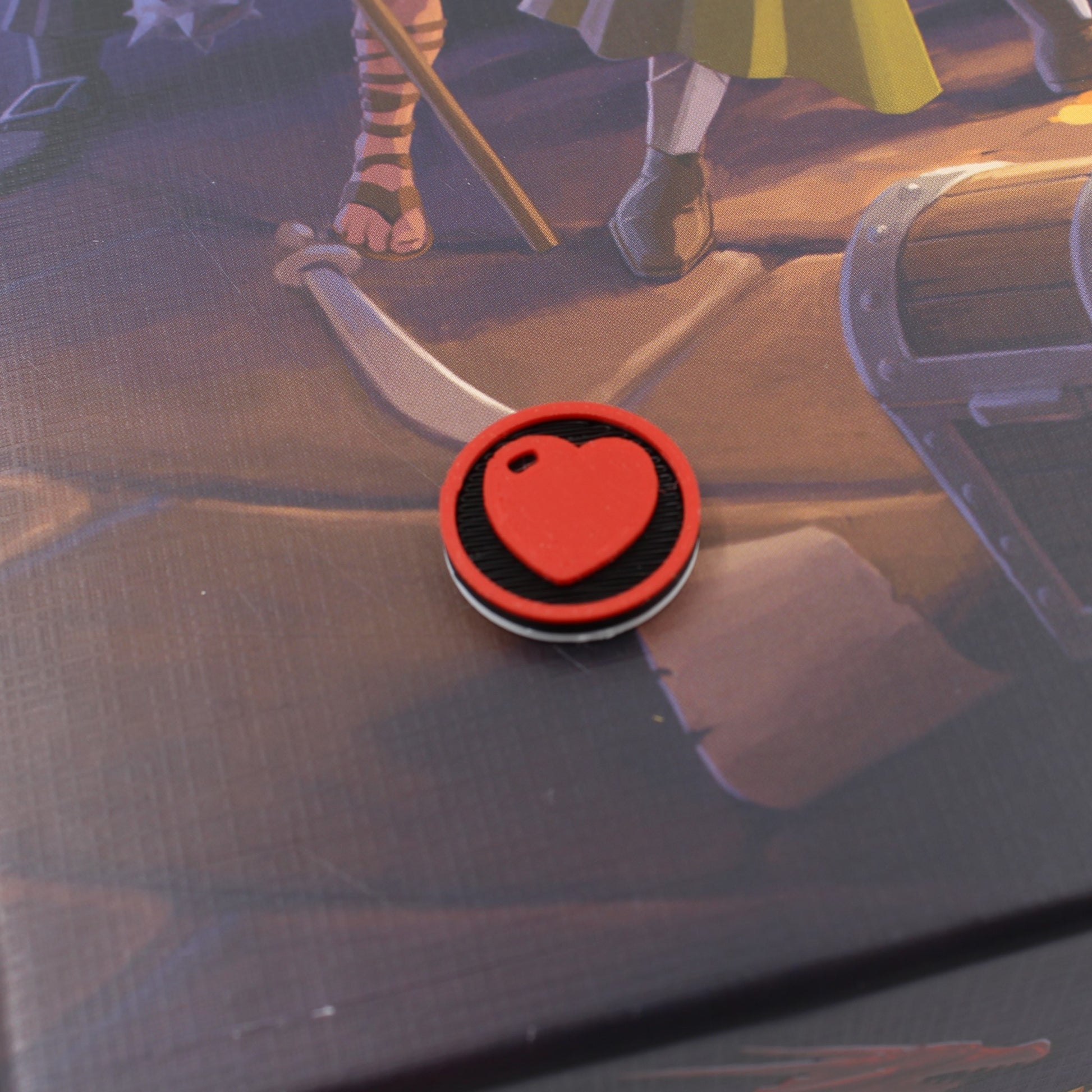Auf der einen Seite sind die roten Lebens- bzw. Herzsymbole, auf der anderen Seite die weißen Schadens- bzw. Totenkopfsymbole abgebildet. Die Symbole und der äußere Kreis sind etwas höher um einen schöneren 3D-Effekt zu erzielen und die Greifbarkeit zu verbessern. Die Marker haben den gleichen Durchmesser wie die originalen Token und passen optimal in die Heldentableaus.