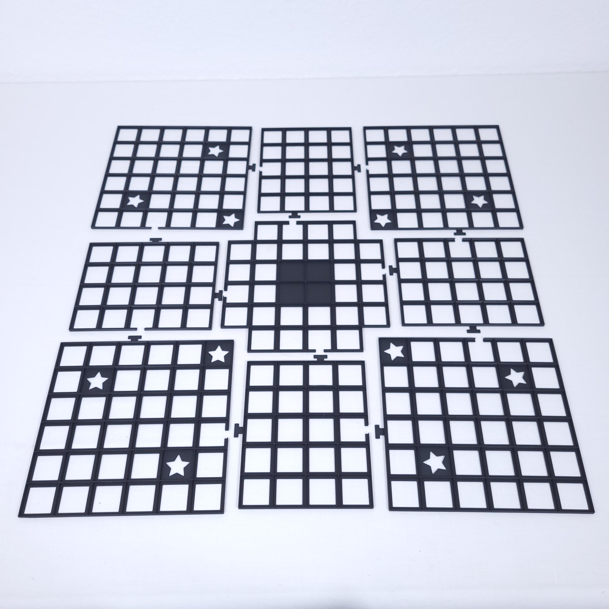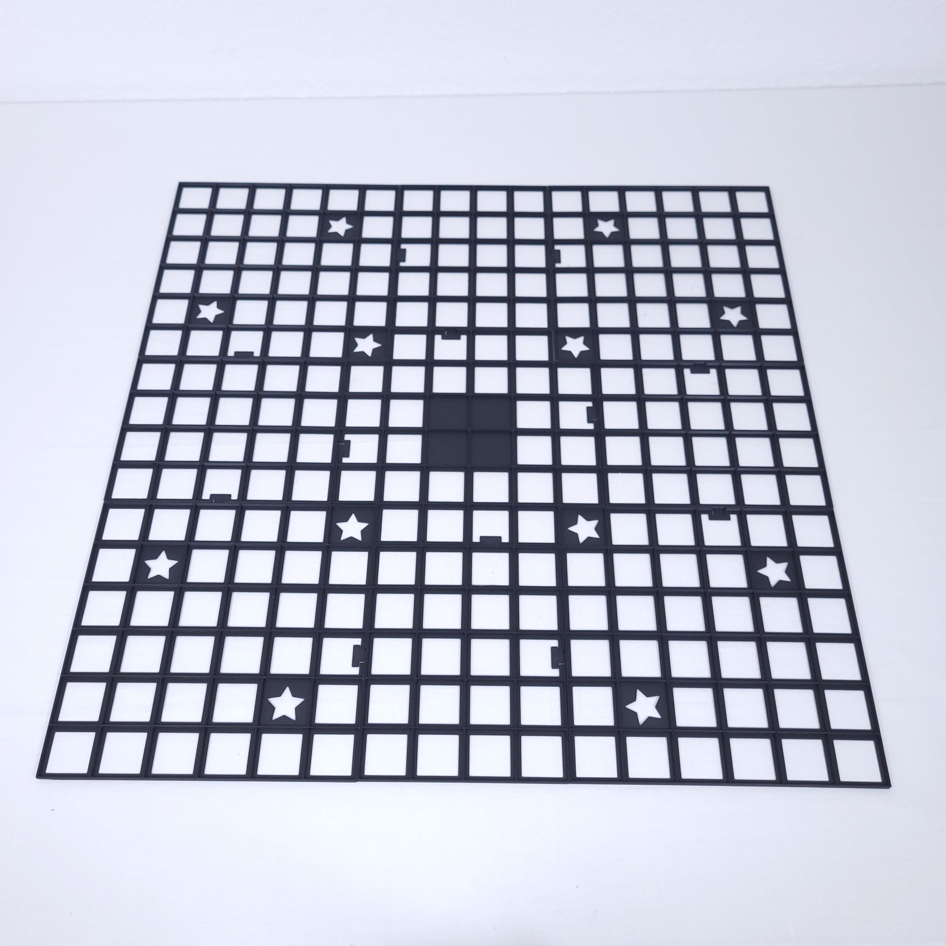 Die 4 gefüllten Felder stellen die Mitte dar, genau wie auf der Papiervorlage. Auf die Sternfelder werden die Sternscheiben gelegt. Alle Gitter zusammen bilden das Spielfeld von 16 x 16 Feldern.