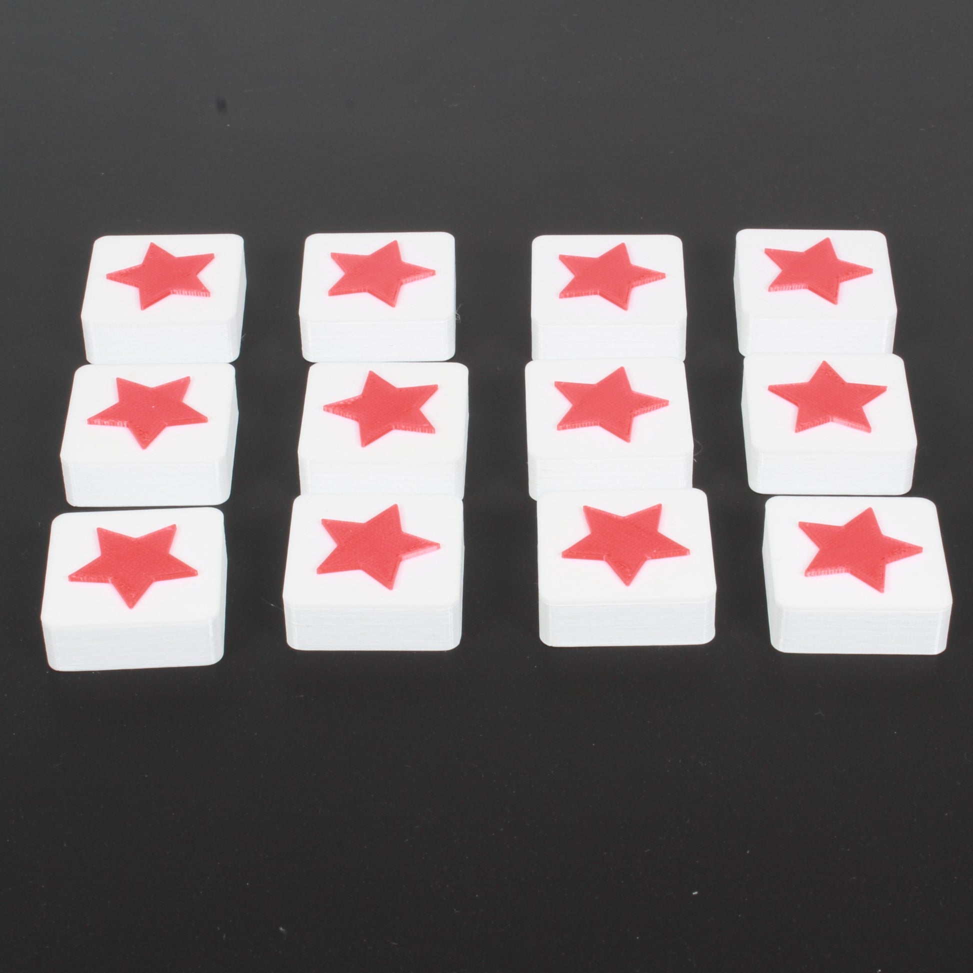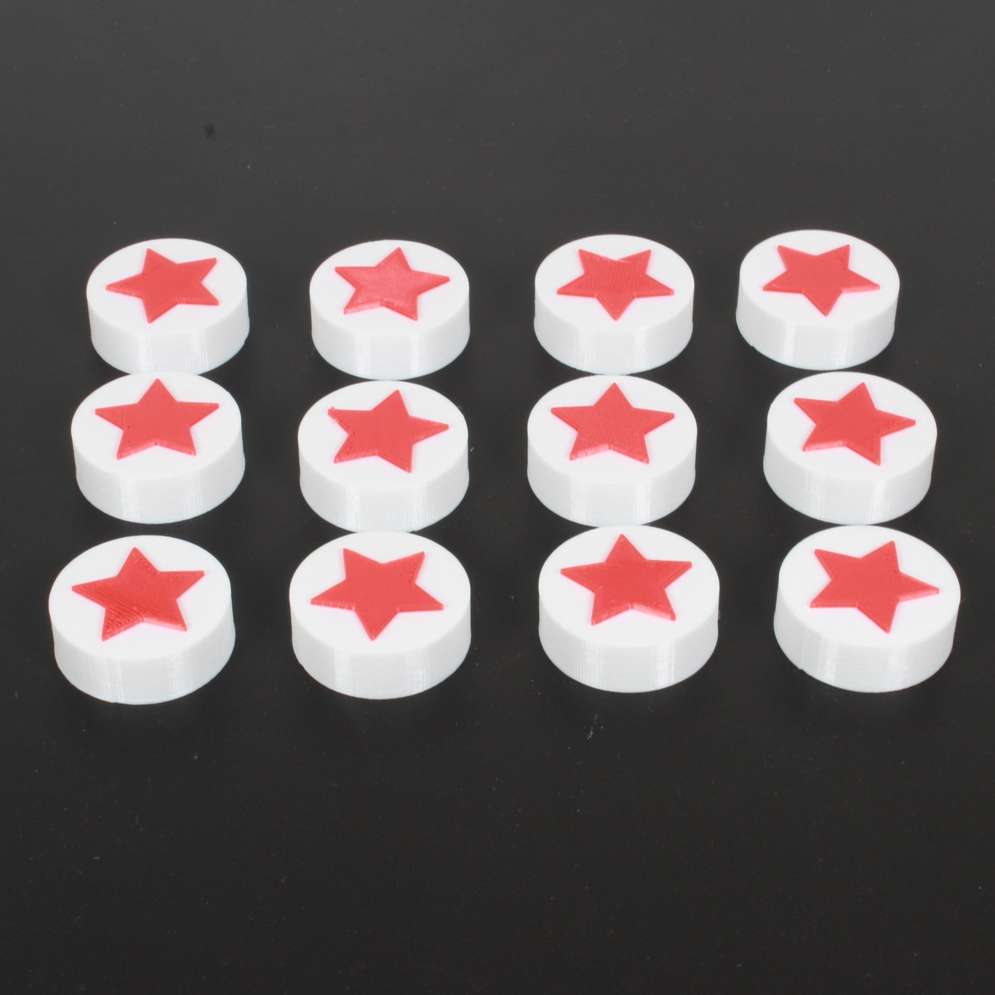 Diese 12 Sternscheiben können als Ersatz oder für die vorhandenen Sternscheiben getauscht werden. Beim Spielen von Qwirkle fiel auf, dass die mitgelieferten Sternscheiben zu klein sind und nicht richtig in das Muster passen, daher wurden auch größere Versionen erstellt.