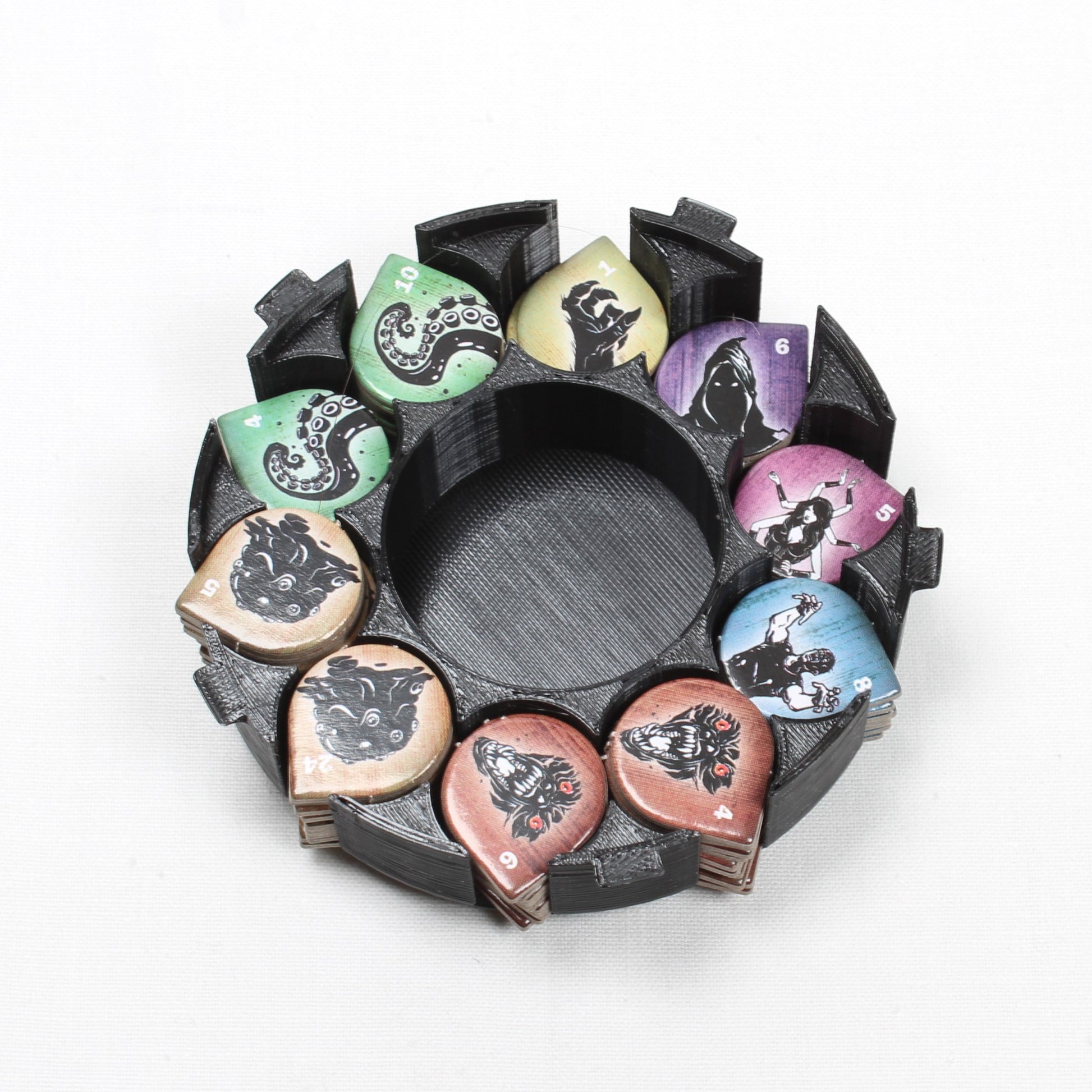 Ein dreiteiliger Organizer für alle Token aus dem Spiel Betrayal at House on the Hill. Der Organizer passt genau in die Aussparung der Originalbox der 2. Edition.