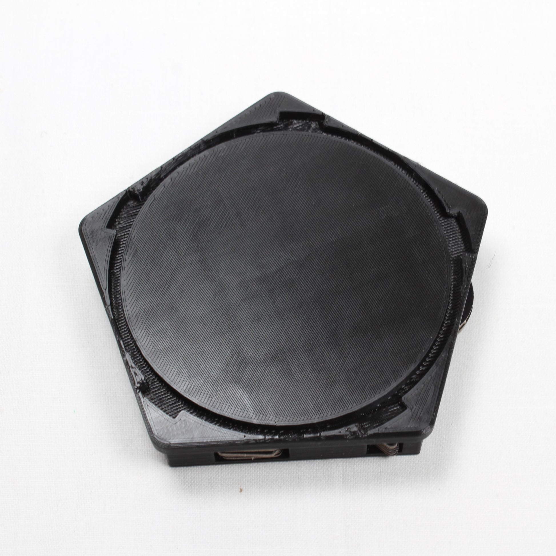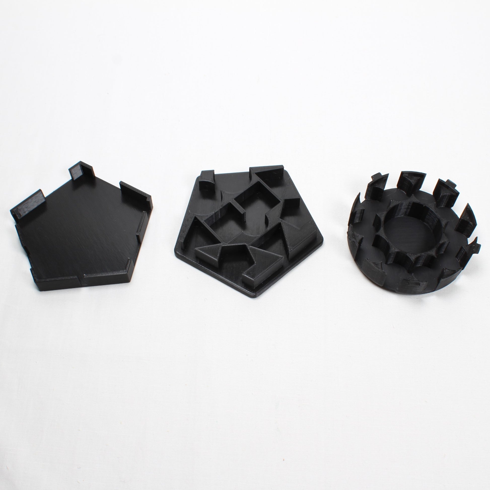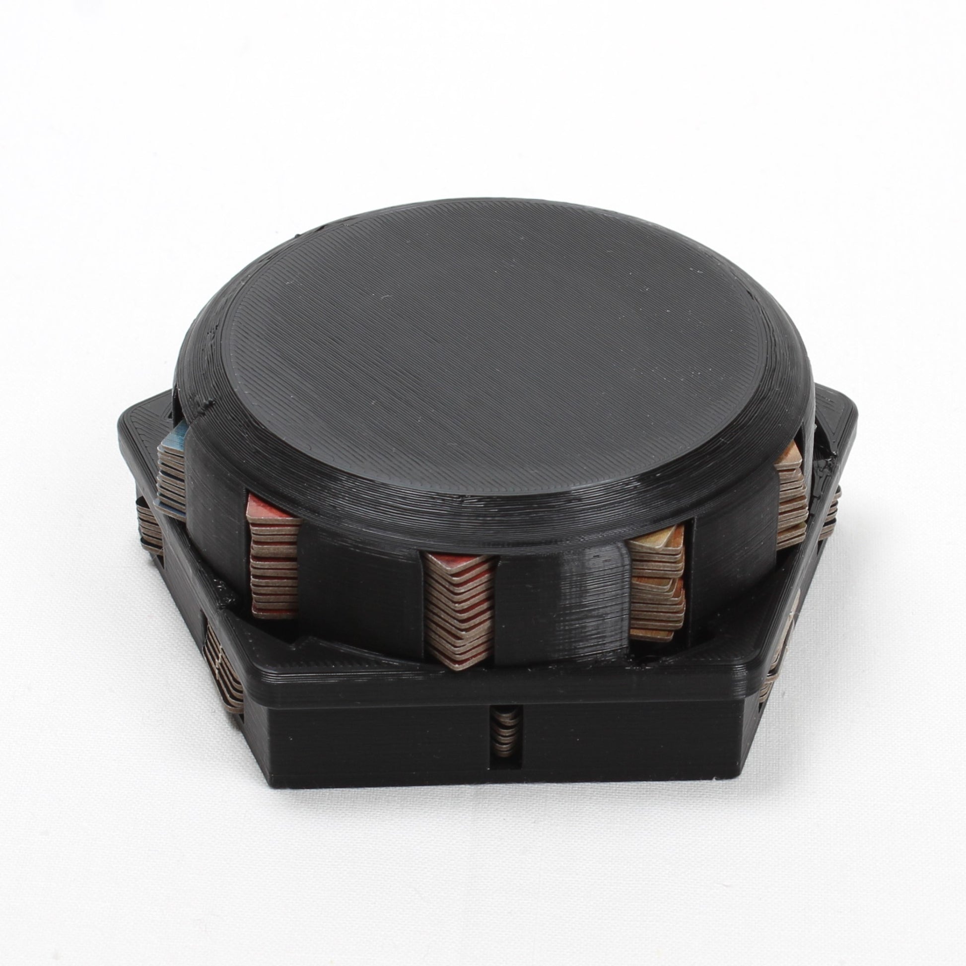 Der obere Teil wird mit per Drehverschluss mit dem unteren Teil verbunden und der Deckel schließt die oberen Token ein, damit diese nicht rausfallen können oder die Box senkrecht gelagert werden kann.